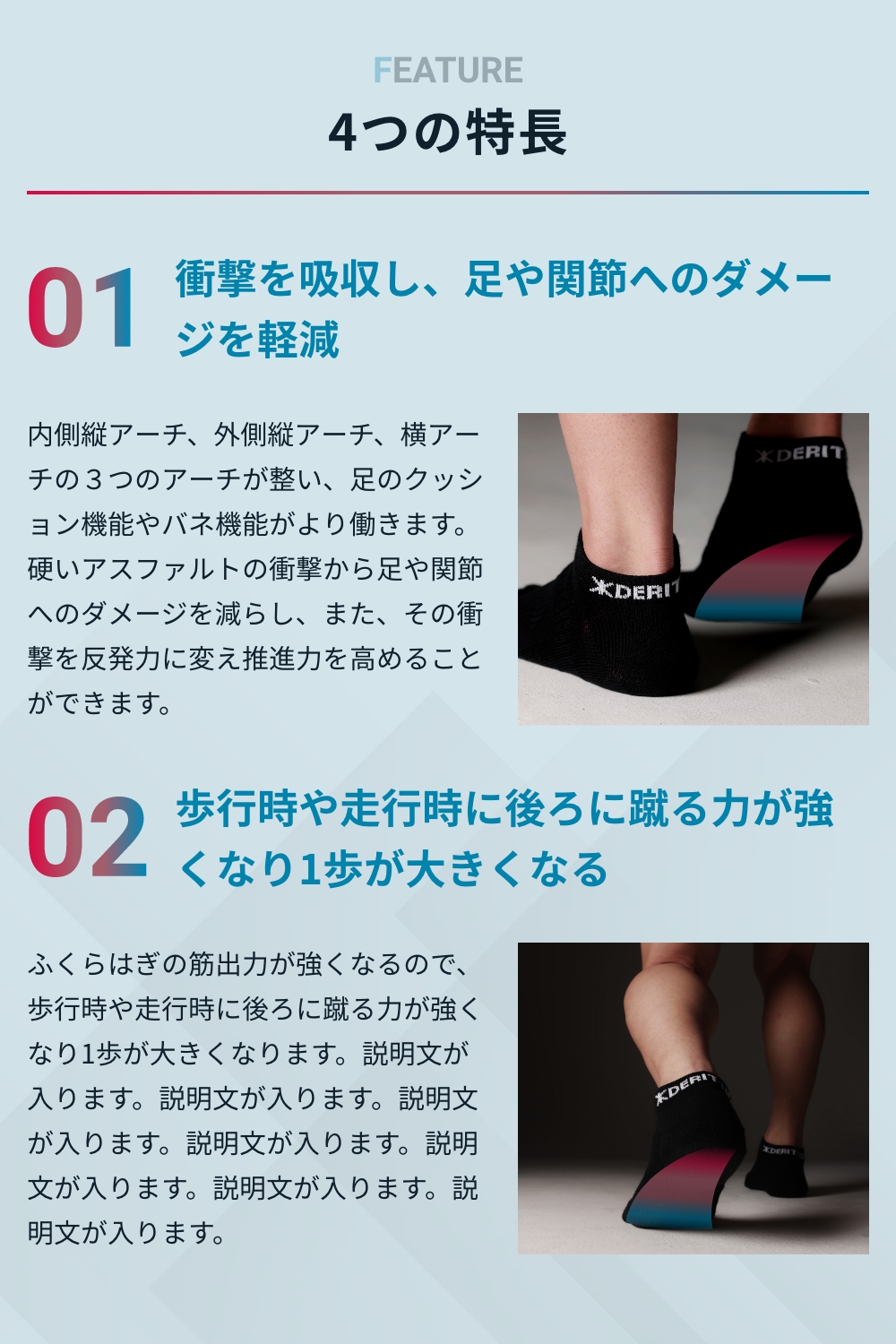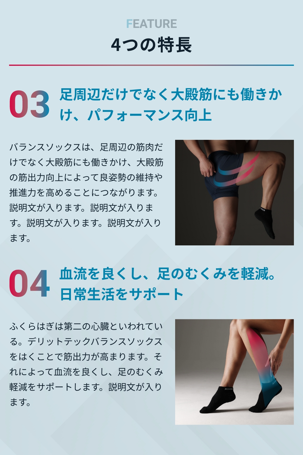 ふくらはぎは第二の心臓といわれています。デリットテック機能性ソックスをはくことでふくらはぎの筋出力が高め、巡りを良くし、足のむくみや疲労感にアプローチします。