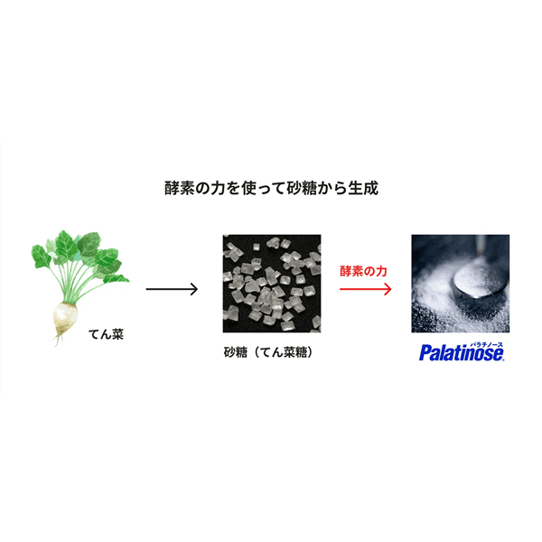 ゆっくり吸収される性質から、持続的にエネルギーを供給できる糖質パラチノースの高純度粉末です。