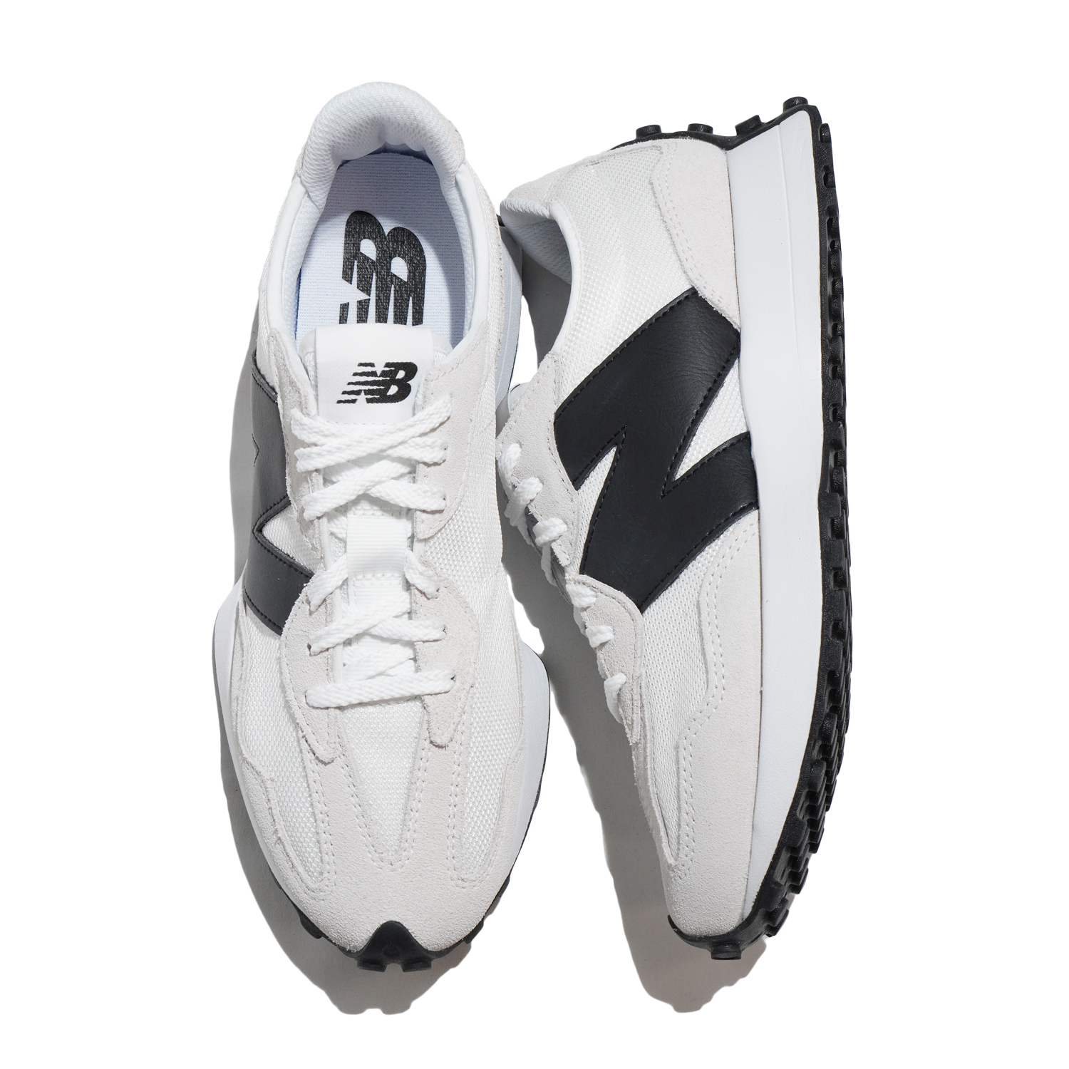 70年代を席巻した数々のニューバランスのレーシングシューズをアレンジしたレトロなフォルムに、ビッグNロゴを外側だけに配した印象的なルックスで提案するメンズモデル「MS327」から新色が登場。スエードとメッシュ素材のアッパーを、ホワイト/ブラックのコンビネーションカラーで展開。