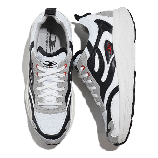アッパーデザインはブランドアイコンでもある“龍”をモチーフに、角のような力強さをウェルダー加工で表現。異素材を組み合わせた立体感あるデザインで、ストリートでも存在感を放ちます。