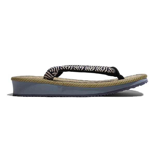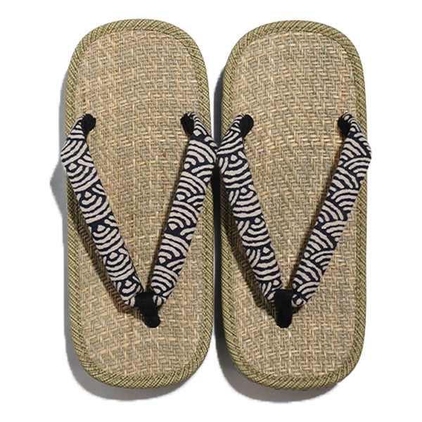 凹凸がありさらりとした履き心地が人気のマライ草天板に、青海波柄の花緒を合わせた雪駄です。馬蘭草は耐久性に優れ、パナマ織は風通しの良い織り方で、擦れに強い事で雪駄の定番品としては根強い人気があります。また、青海波柄は「無限に広がる穏やかな波に未来永劫と、平和な暮らしへの願い」が込められていると言われる、縁起の良い吉祥文様です。どちらも古くから根強い人気を誇る伝統的な素材・柄を合わせた「伝統×伝統」の雪駄。渋くて粋な雪駄の底材は、軽量でクッション性の高いEVA素材を使った滑りにくいデザインの大和工房オリジナルで、非常に履きやすくなっております。