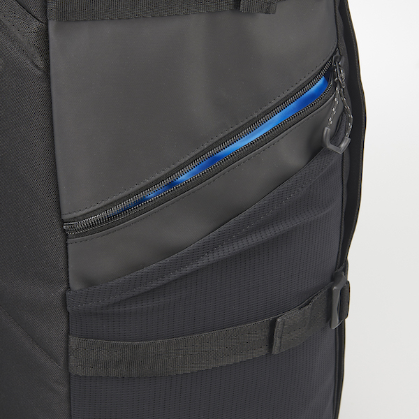 両サイドにはファスナーポケットと500mlのペットボトルの収納も可能なメッシュポケット、