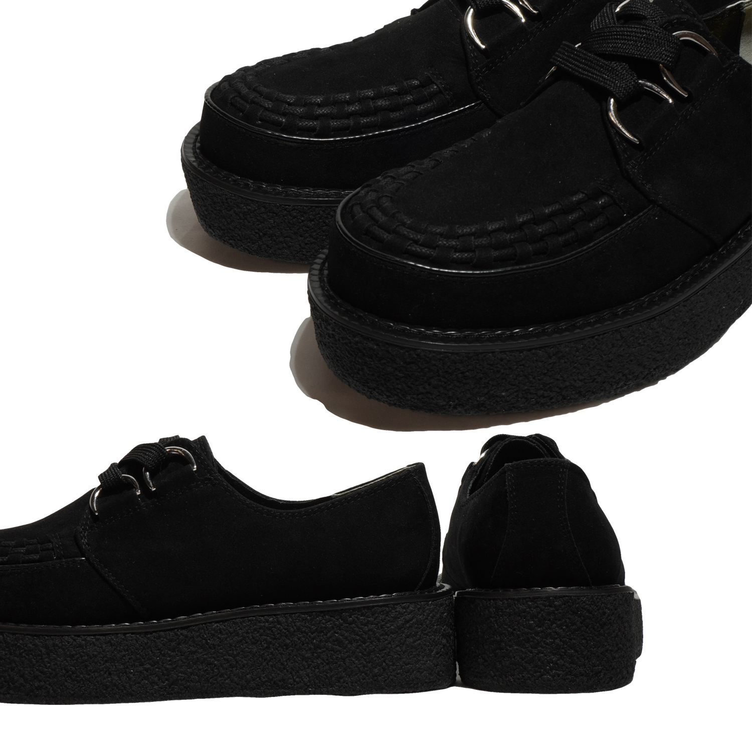 動物性の素材不使用のヴィーガンスエードレザーを使用したラバーソールシューズ。ヒールは40mm、つま先29mmの生ゴムを採用したソールは足へ衝撃を吸収し、日本人向けの木型で履き疲れしにくいモデルです。6番ソールをベースに作られ、ラバーソールらしいシルエットと驚異の軽さを実現しています。つま先の編み込みまでこだわった仕様で、ライブハウスやコンサート会場、音楽の現場で履いてほしい、履くだけでサブカルチャーを感じられる靴です。