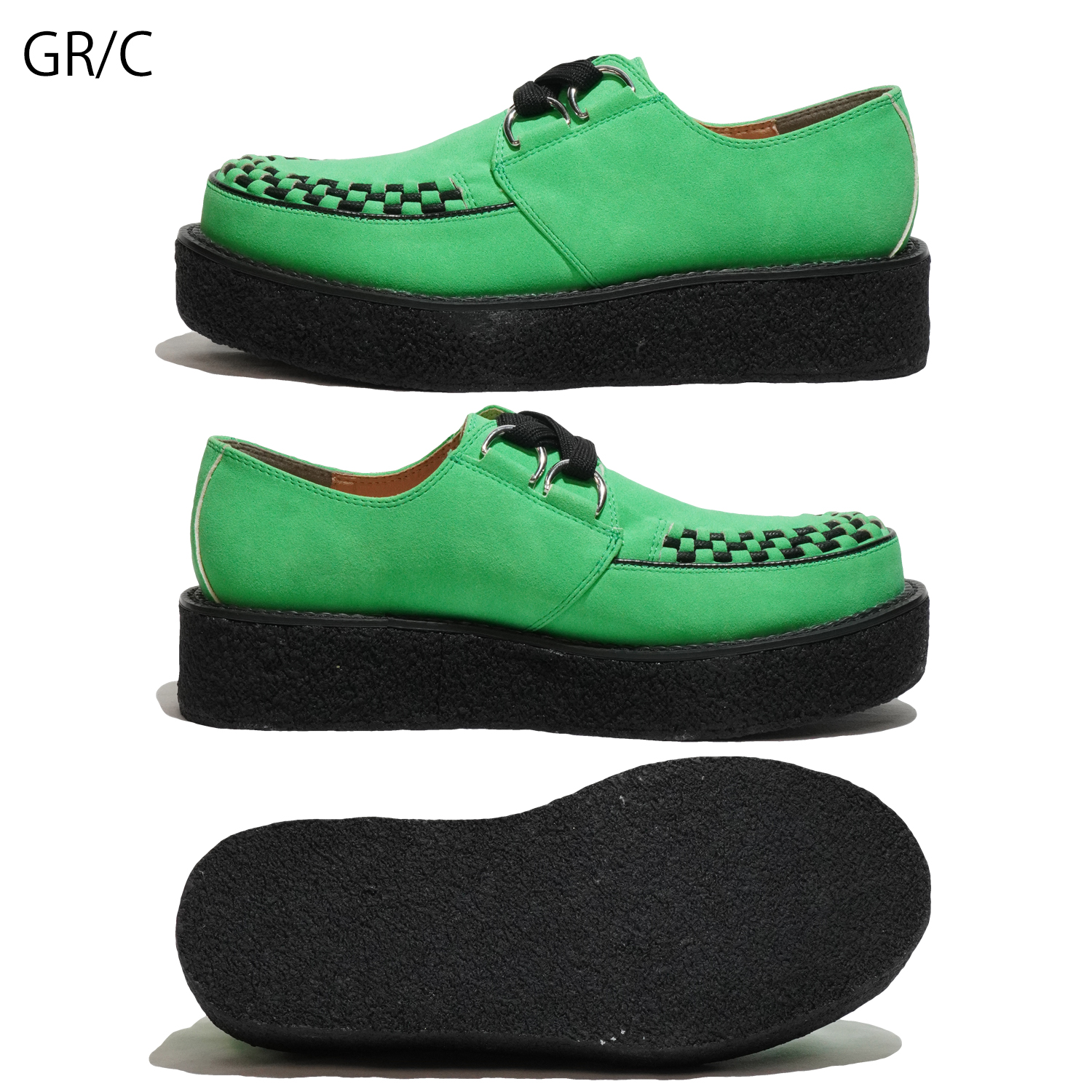 動物性の素材不使用のヴィーガンスエードレザーを使用したラバーソールシューズ。ヒールは40mm、つま先29mmの生ゴムを採用したソールは足へ衝撃を吸収し、日本人向けの木型で履き疲れしにくいモデルです。6番ソールをベースに作られ、ラバーソールらしいシルエットと驚異の軽さを実現しています。つま先の編み込みまでこだわった仕様で、ライブハウスやコンサート会場、音楽の現場で履いてほしい、履くだけでサブカルチャーを感じられる靴です。