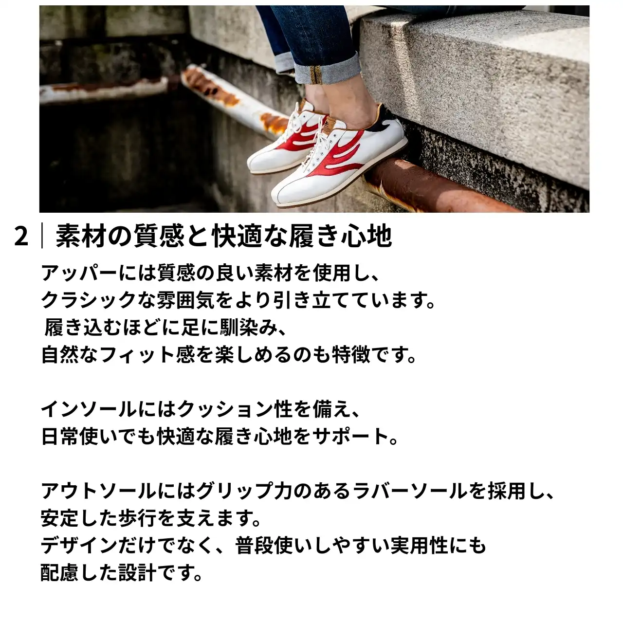 薄いソールが足にフィットし、軽快な履き心地を実現したモデルです。