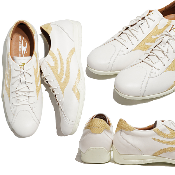 ブランドライン、サイドそしてヒールタブにスネーク型押し素材を使用する斬新なマテリアルミックスが特徴。