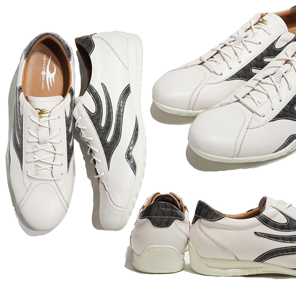 ブランドライン、サイドそしてヒールタブにスネーク型押し素材を使用する斬新なマテリアルミックスが特徴。