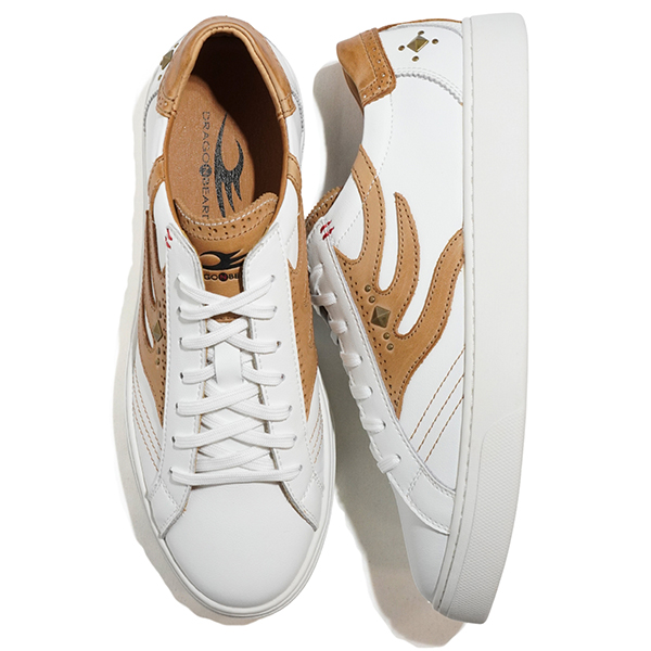 アッパーには滑らかなホワイトレザー、部分パーツにはには焦しレザーを採用。