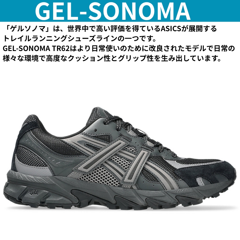GEL-SONOMA TR62はアウトドアにおける”探検”をコンセプトにしたシューズです。 この新しいスタイルは、GEL-KAHANA 6、GEL-TREKKER、GEL-EAGLETRAILシリーズからデザインのインスピレーションを得ています。ベースとなったモデルたちはもともと競技用のトレイルランナーのために作られたものですが、今回のモデルは日常使いのために改良されています。 ソールはGEL-SONOMAシリーズ2代目までの構造を使用しており、日常使いなどのさまざまな環境で高度なクッション性とグリップ性を生み出します。