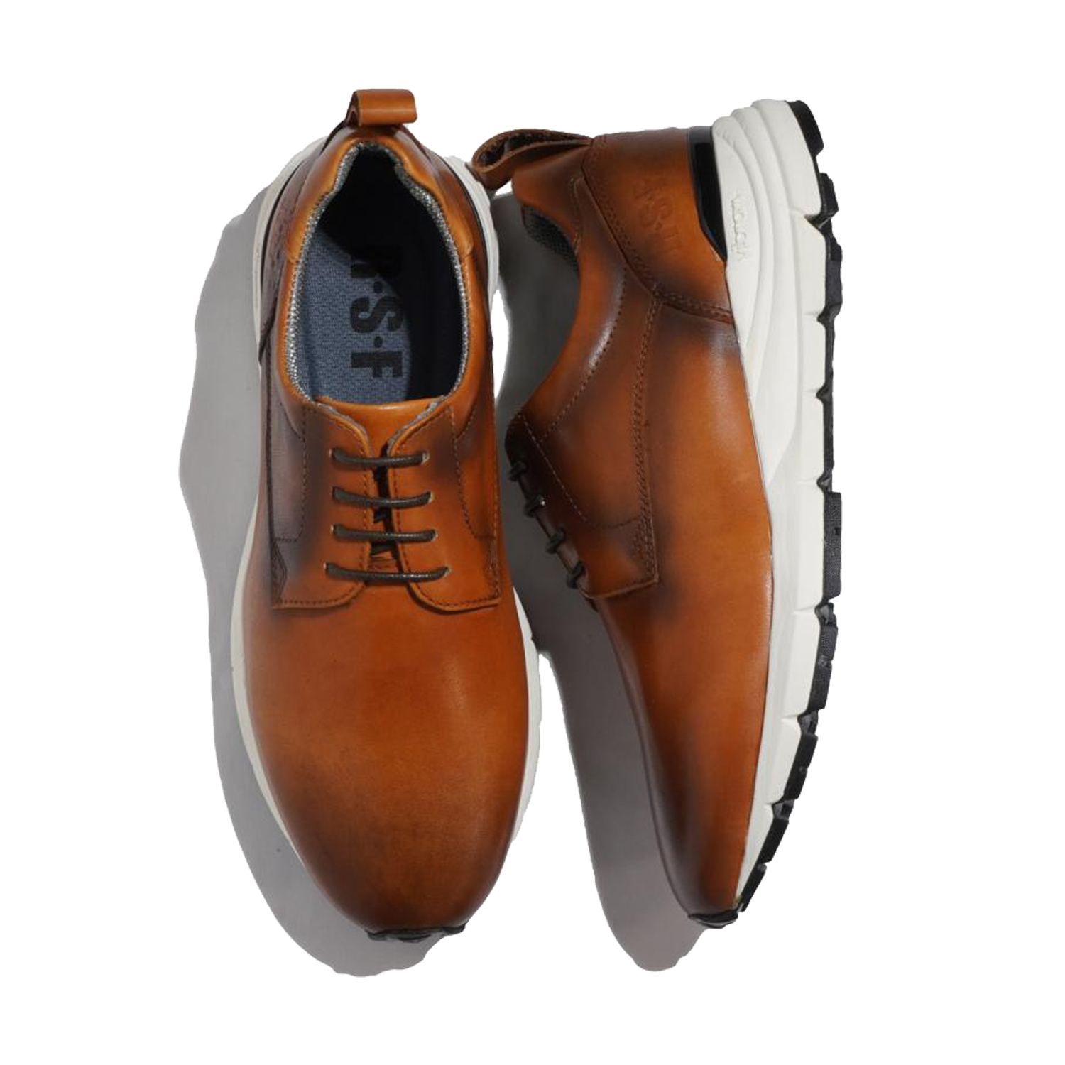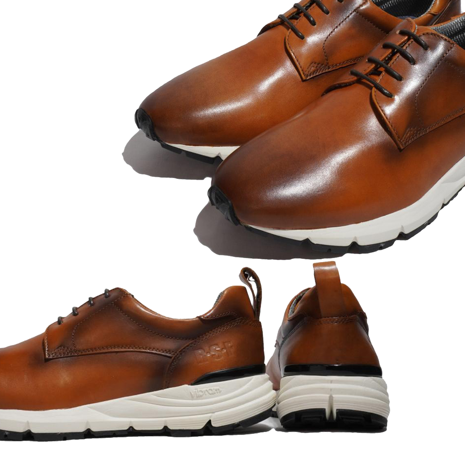 革の質感を活かす為にあえてシンプルなシューズに仕上げたシューレースデザイン。BLACKはシボ感のあるレザー、BROWNは焦がし加工を施したレザーにする事で革本来の質感や温かみのある雰囲気。「履いてラク、毎日履きたくなる靴。」をテーマにしているので足入れもゆったりとしており、革の足なじみも体感できるシューズです。アウトソールは履き心地を追求するために、Vibramソールを使用。クッション性、グリップ力、耐摩耗性も向上しており、ちょっとした山道や雨の日にも滑りづらい設計があなたの日常を快適にサポートしてくれる仕上がりになっております。