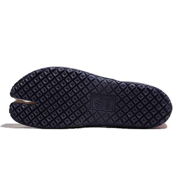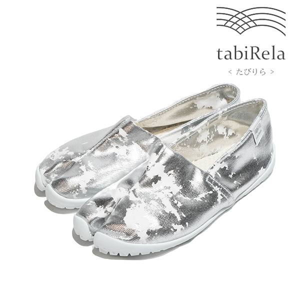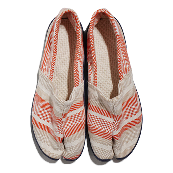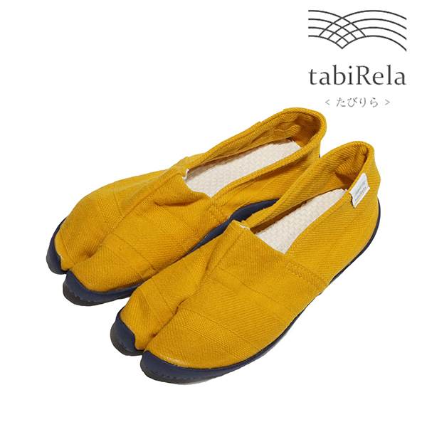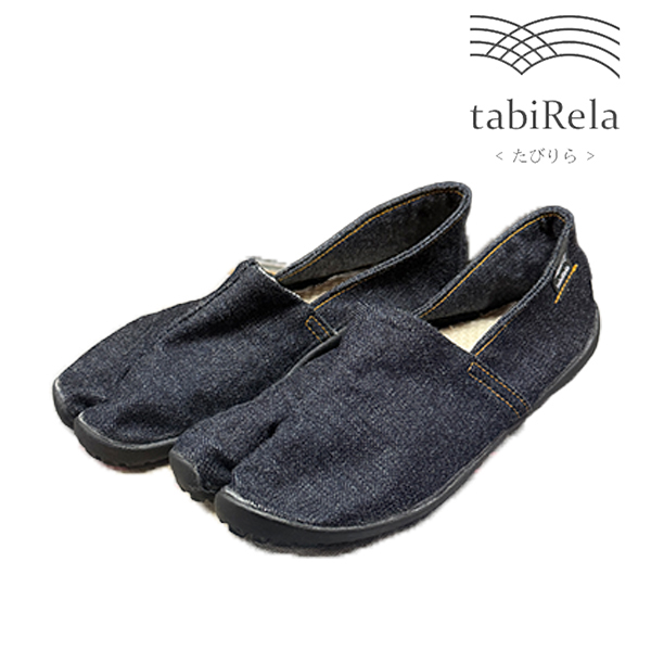 足袋型コンフォートシューズ たびりら。100年の歴史の中で培った足にフィットする足型とこだわりの材料を組み合わせた、履き心地を追求した1足です。アッパーは倉敷の帆布メーカータケヤリ社製の生地、インソールは肌あたりのよい綿100%刺子を使用しています。薄くてやわらかいソールは歩きやすく、はだしのような履き心地を実感できます。※生成り原反をロット毎に手染めで処理しております。