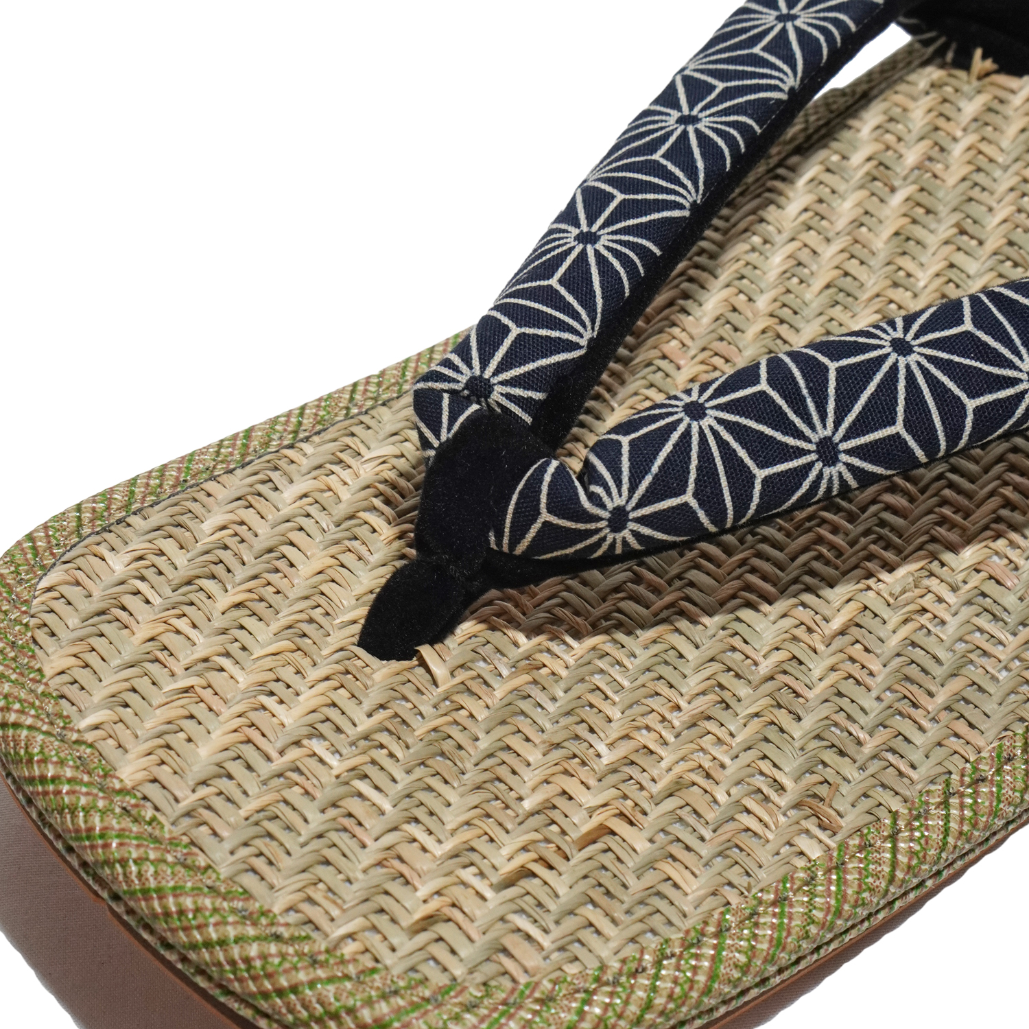 馬蘭草をパナマ織りの技法で織った、涼しげな印象の天板。馬蘭草は耐久性に優れ、パナマ織は風通しの良い織り方で、擦れに強い事で雪駄の定番品としては根強い人気があります。底は軽量の合成ラバー材ですので、お求め安い値段と耐久性から粋な普段履きとしても人気の商品です。