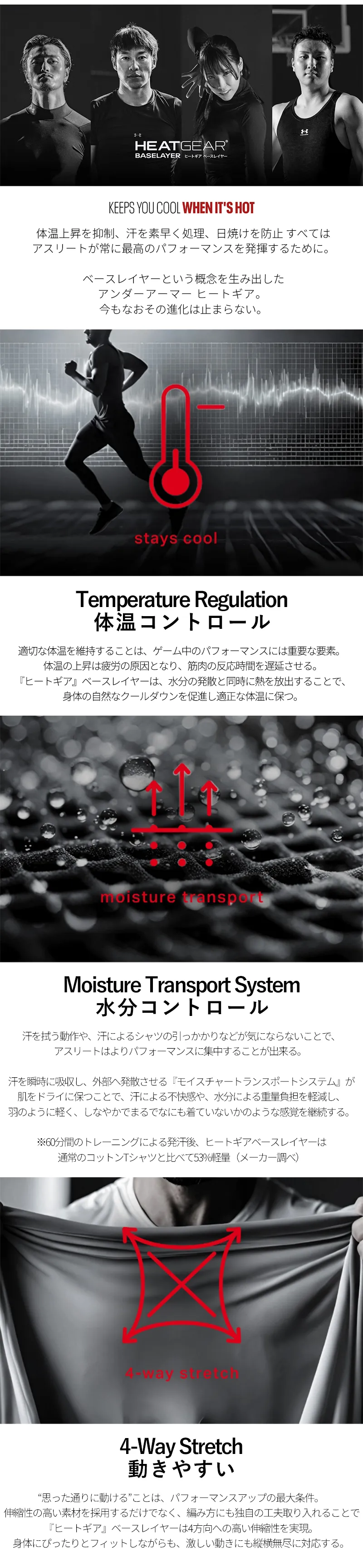 体温上昇を抑制、汗を素早く処理、日焼けを防止 すべてはアスリートが常に最高のパフォーマンスを発揮するために。
