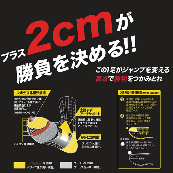 | 特性 | ジャンプ性能 | グリップ性能 | V-FIT構造 | 抗菌防臭機能 | 2枚組 |