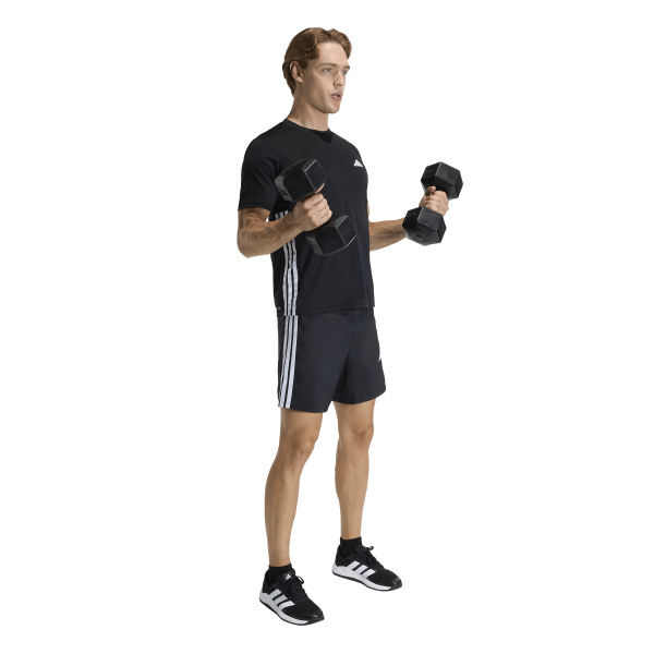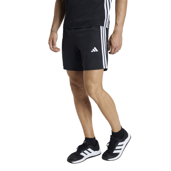 トレーニングには、ワークアウト エッセンシャル ベース スリーストライプス ウーブン ショーツが信頼できる選択肢。