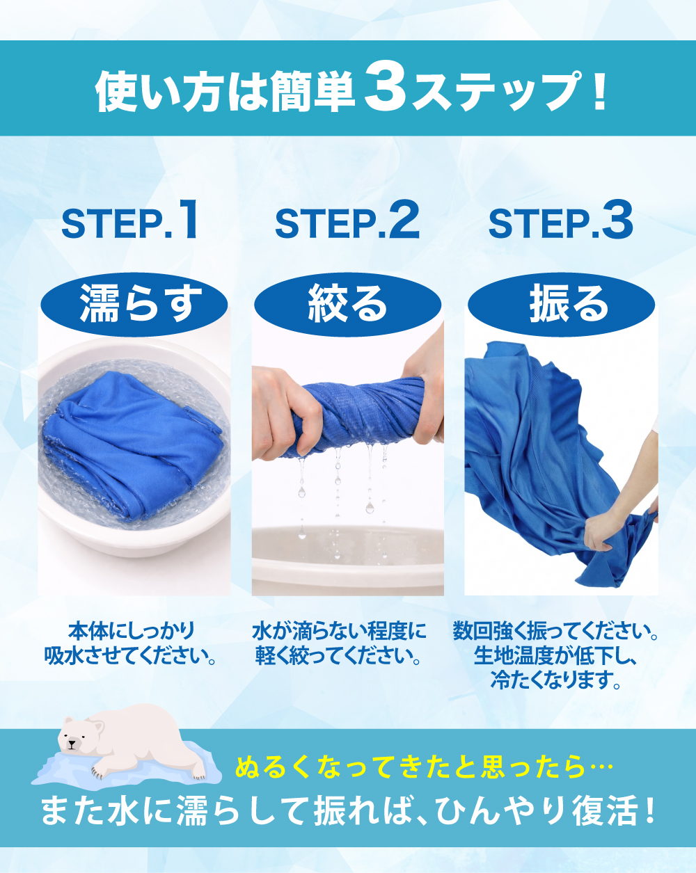水に濡らして、絞って振るだけで何度でもひんやり!