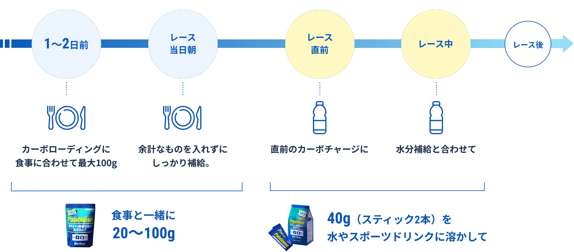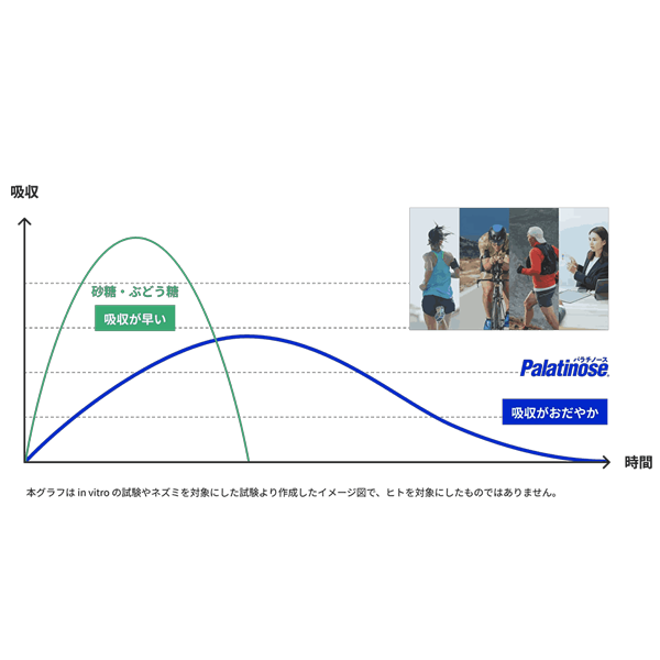 小腸全体でゆっくり吸収されるので、 特にマラソンやトライアスロンなど持久系のスポーツなどに、おすすめの糖質です。