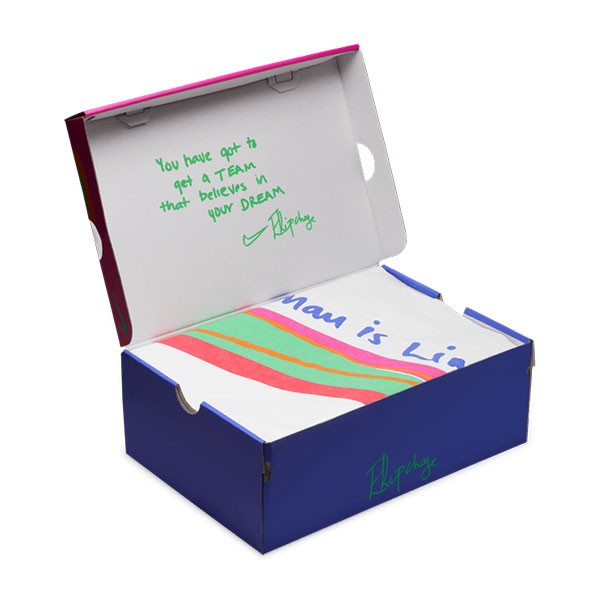 エリウド・キプチョゲは、一緒にトレーニングする人に必ず、成長を象徴するものとして彼のベースキャンプに木を植えてもらいます。ソックライナーのグラフィックはその成長を模したデザインで、シューズのつま先に向かって伸びる枝をあしらっています。レッドクレイのカラーグラデーションは、トレーニング中にシューズに付くケニアの土をイメージしています。フォントは、表面がフラクタルのような模様を成すアフリカの木をヒントにしたデザインです。