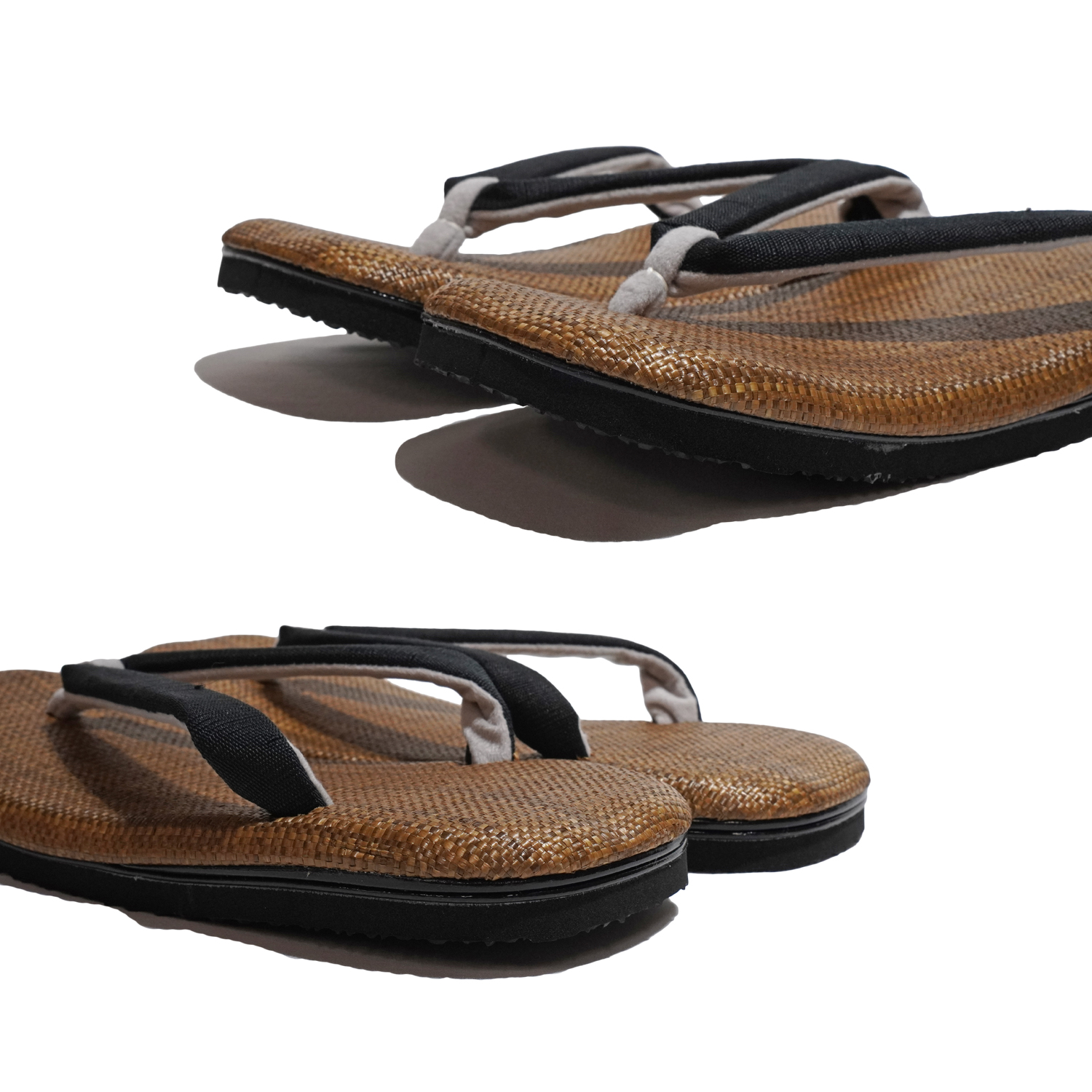天板は合成繊維のパナマ織りの技法で織られたものを用い、擦れに強く耐久性に優れ涼しげな印象のインソールと、柄の形に凹凸ある生地で、暑い時期にも心地よい感覚の雪駄。花緒は落ち着いた渋めの配色で、シンプルな中に新しさと実用性を兼ね備えたスタイル。底材に大和工房オリジナルの弾力性・耐摩耗性に優れたラバー底を使用する事で、濡れたタイルや石畳でも滑りにくい仕様となっており、安全性を高めています。