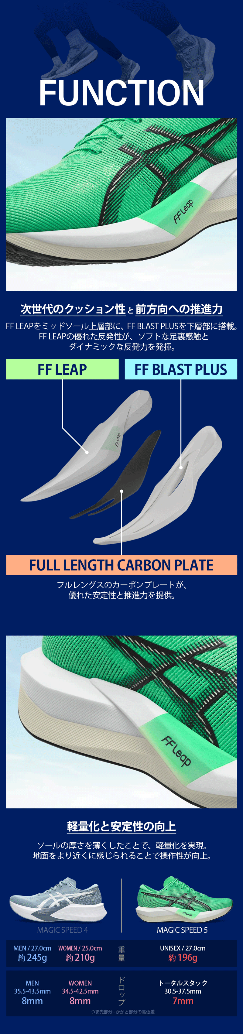 MAGIC SPEED 5 は、ミッドソールに反発性とクッション性に優れたFF LEAPを上層部に、安定性に優れたFF BLAST PLUSを下層部に採用。