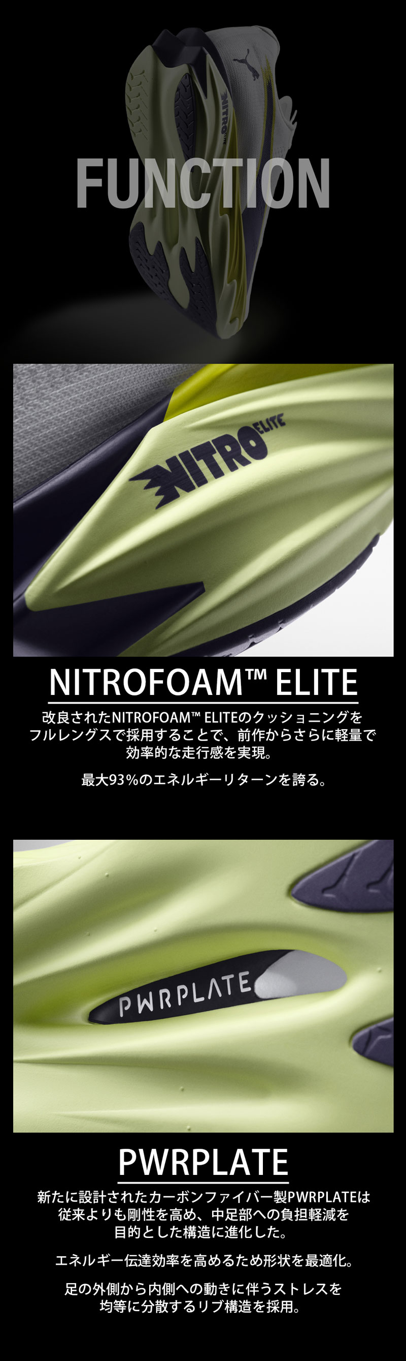最大93%のエネルギーリターンを誇る NITRO FOAM™ ELITE をフルレングスで搭載し、カーボンファイバー製 PWRPLATE と組み合わせることで、効率的なヒールからつま先への移行と圧倒的な推進力を実現。