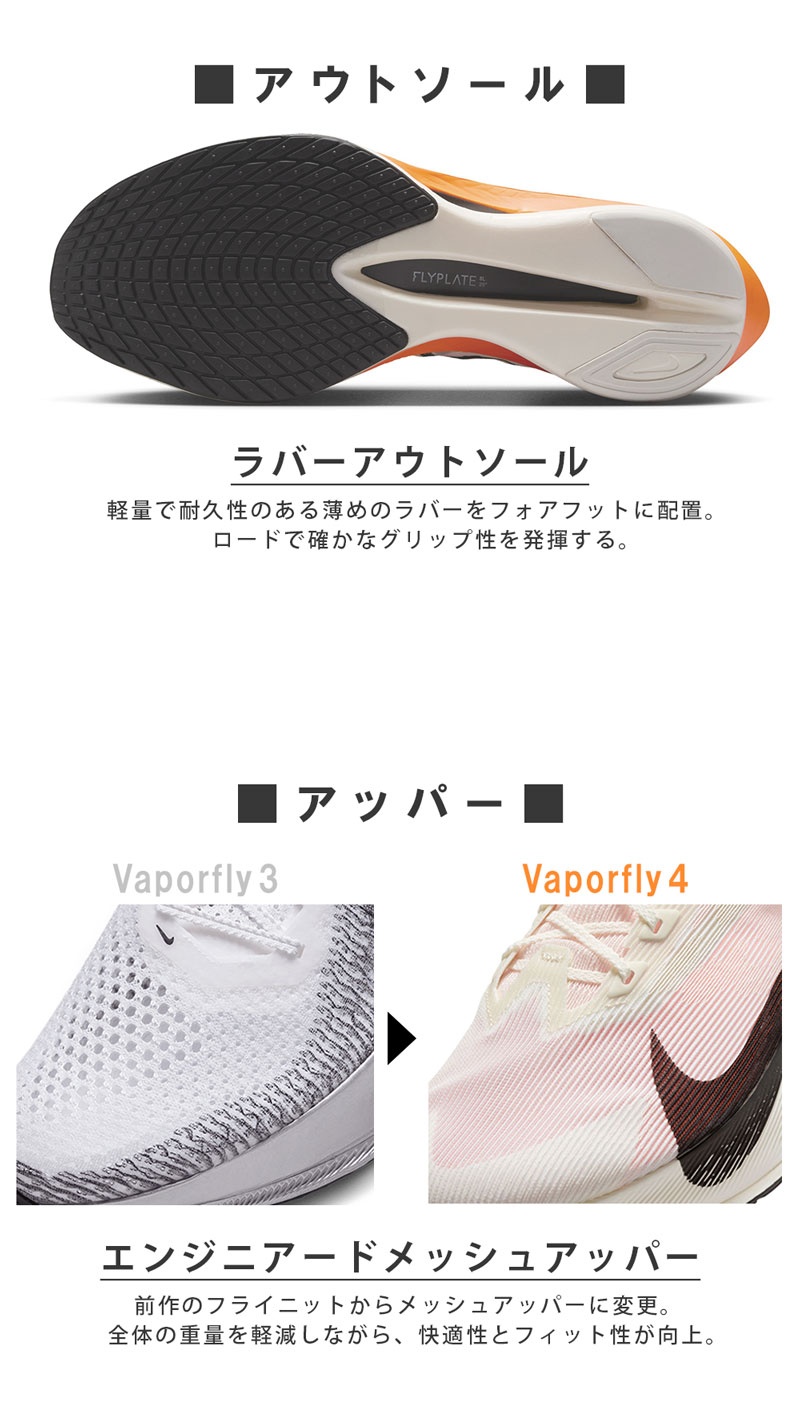パフォーマンスを損なうことなく、ミッドソール、アウトソール、アッパーをヴェイパーフライ 3より軽量化しました。