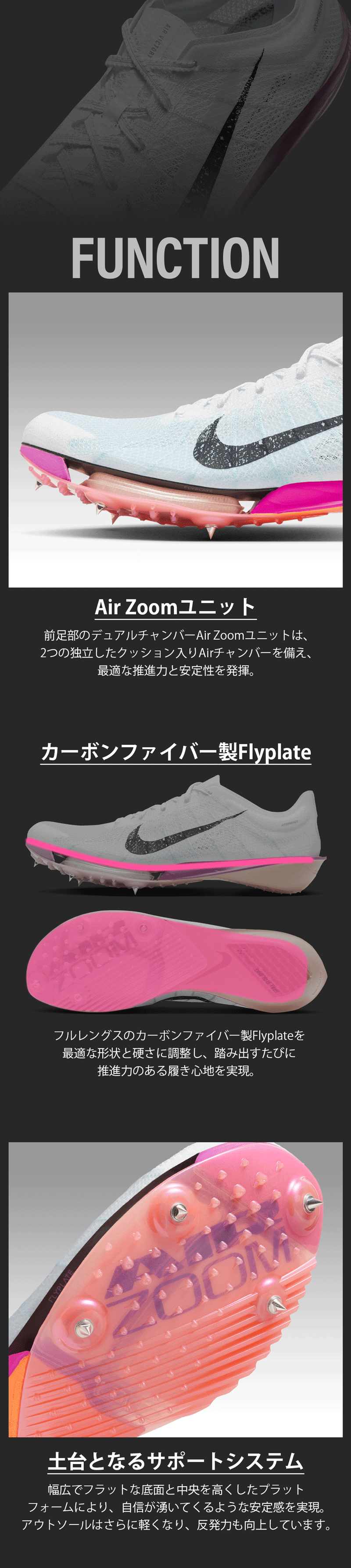 前足部のAir Zoomユニットは2つのチャンバーを備え、スタートからゴールまで後押しされる感覚と安定感を提供します。