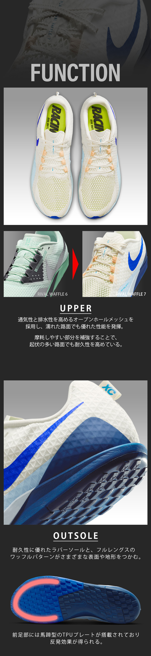 通気性に優れたアッパーとワッフルアウトソールが、レースや日々のトレーニングをサポート。