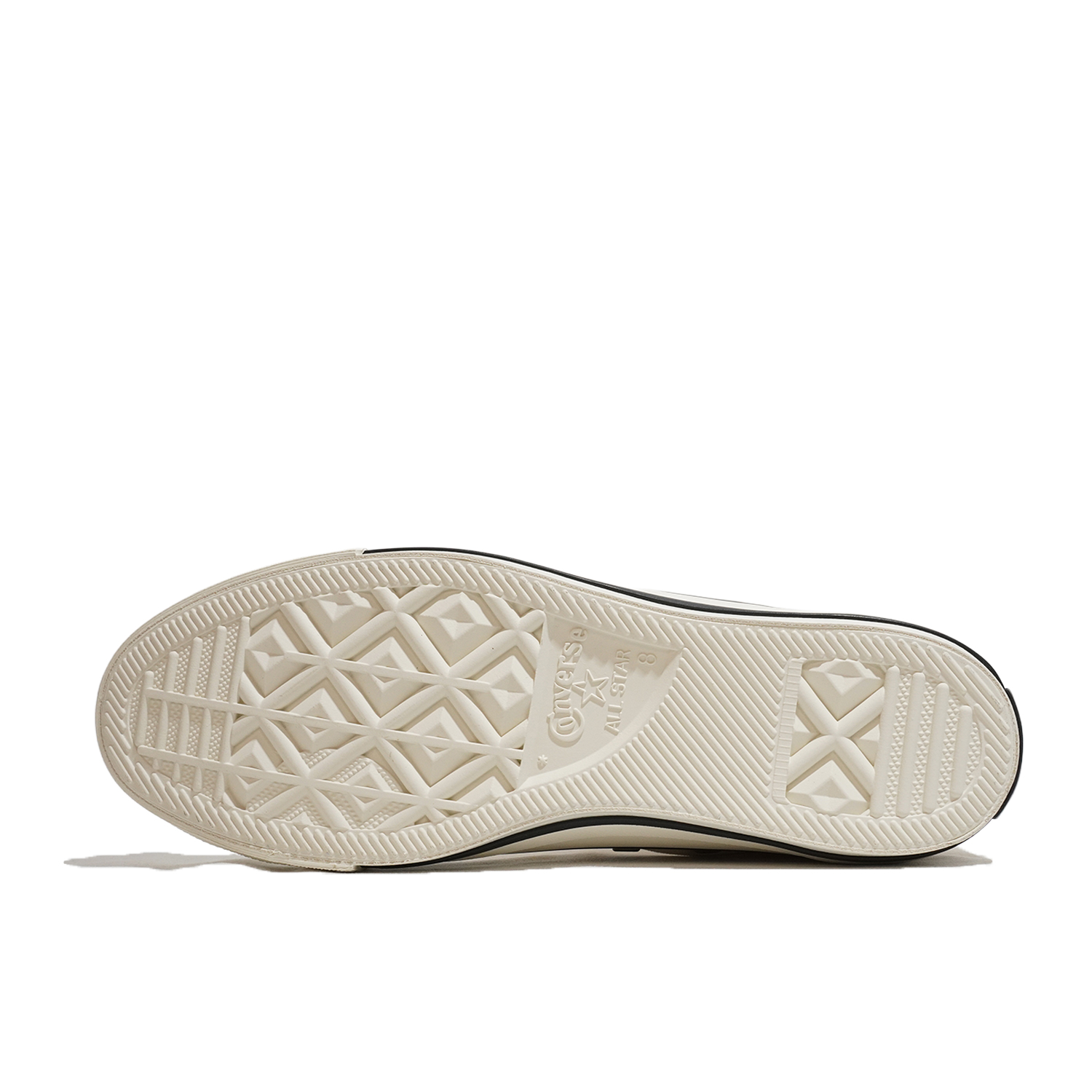 オールスターのパターンアレンジモデル。ジッパーを外腰に配した着脱性の高いモデル。第一ハトメとジッパーの引き手に立体的な星モチーフを採用。ハトメやジッパー、アンクルパッチのロゴにはアンティークゴールドを採用。アンクルパッチのベースカラーをアッパー同色にしたり、ヒールラベルのベースカラーをブラックにすることで、シックにまとめたデザイン。