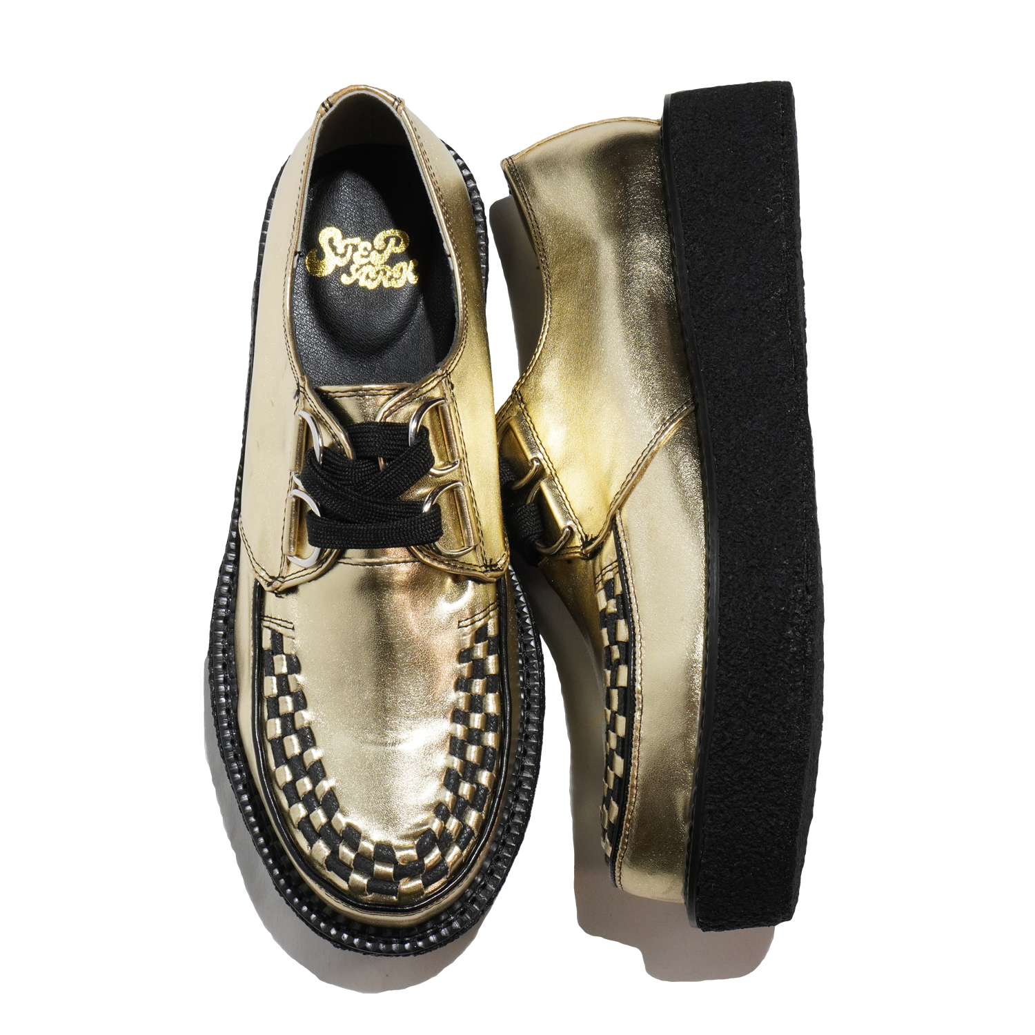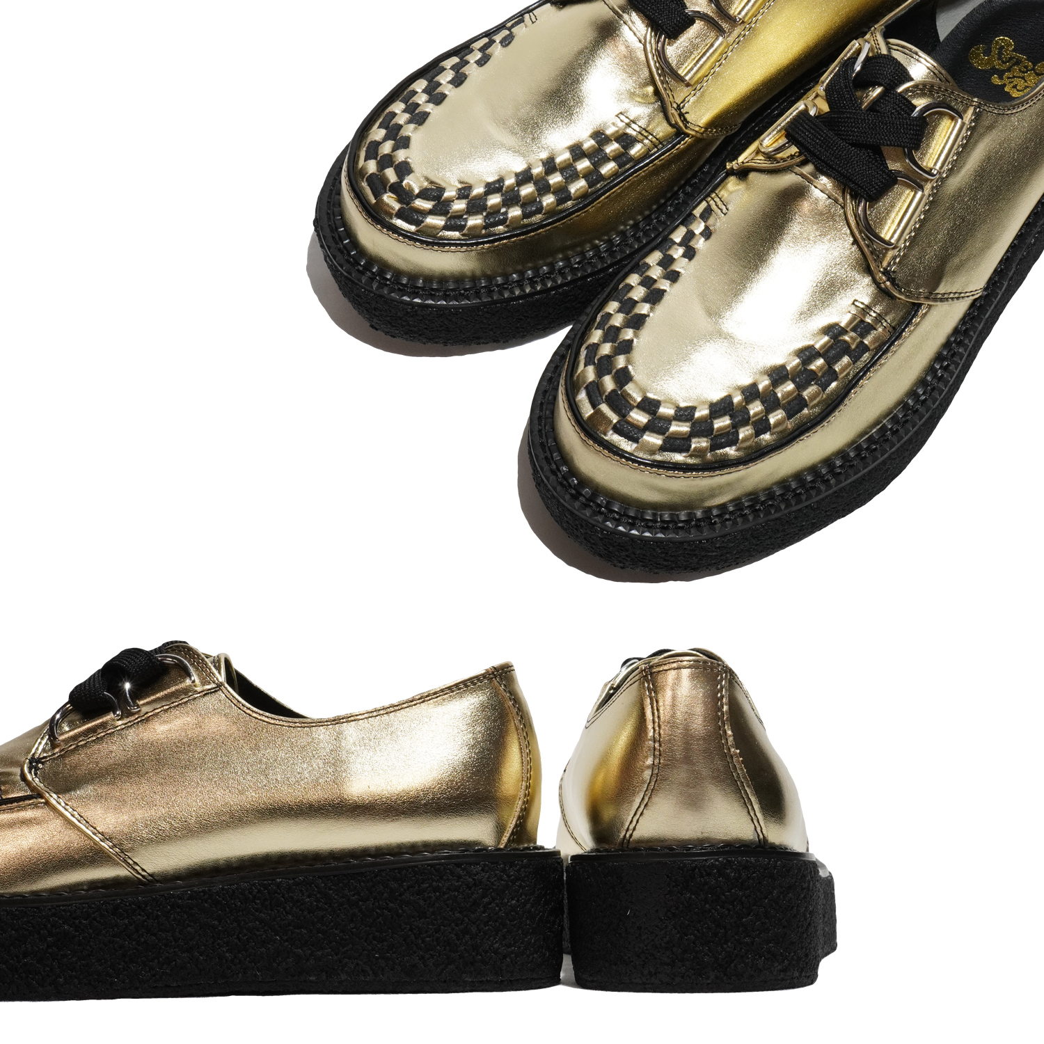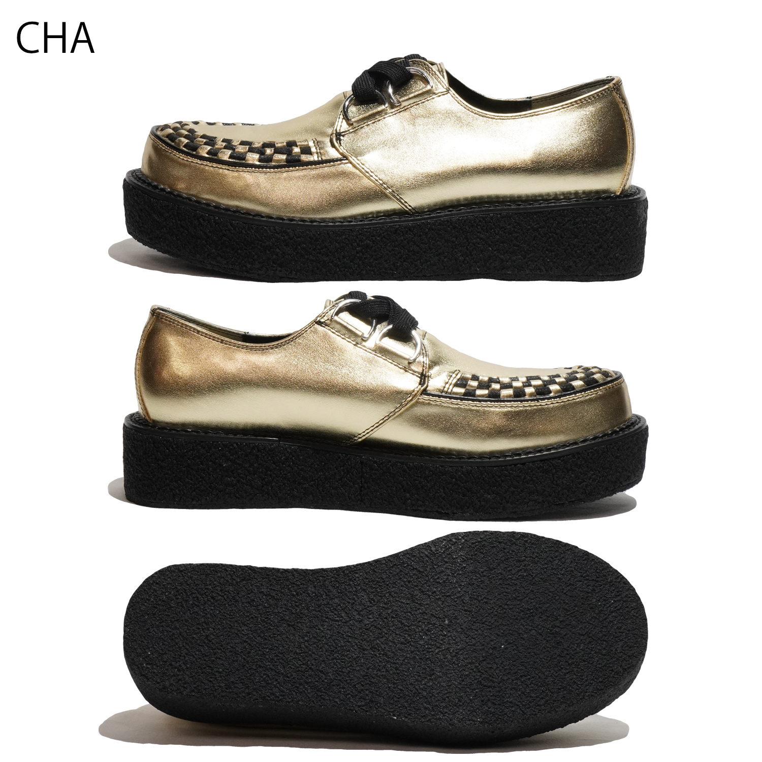 動物性の素材不使用のヴィーガンレザーを使用したラバーソールシューズ。ヒールは40mm、つま先29mmの生ゴムを採用したソールは足へ衝撃を吸収し、日本人向けの木型で履き疲れしにくいモデルです。6番ソールをベースに作られ、ラバーソールらしいシルエットと驚異の軽さを実現しています。つま先の編み込みまでこだわった仕様で、ライブハウスやコンサート会場、音楽の現場で履いてほしい、履くだけでサブカルチャーを感じられる靴です。