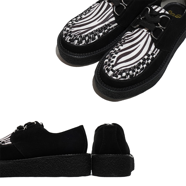 動物性の素材不使用のヴィーガンレザーを使用したラバーソールシューズ。ヒールは40mm、つま先29mmの生ゴムを採用したソールは足へ衝撃を吸収し、日本人向けの木型で履き疲れしにくいモデルです。6番ソールをベースに作られ、ラバーソールらしいシルエットと驚異の軽さを実現しています。つま先の編み込みまでこだわった仕様で、ライブハウスやコンサート会場、音楽の現場で履いてほしい、履くだけでサブカルチャーを感じられる靴です。