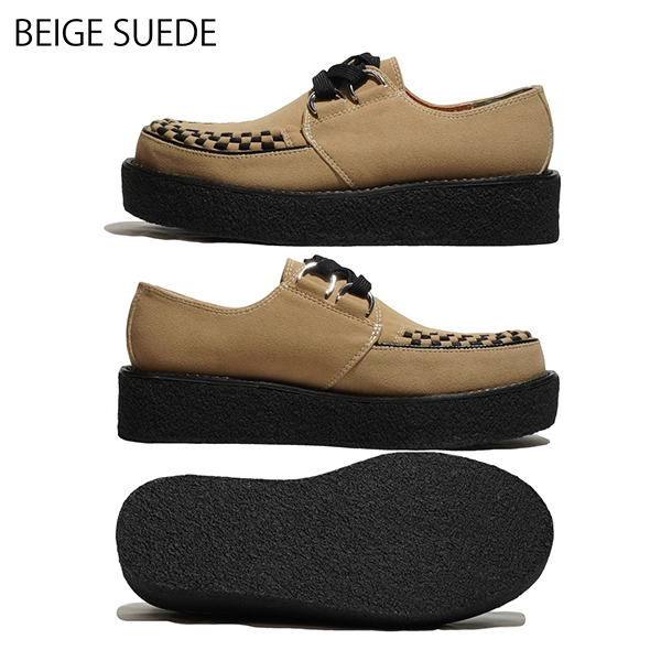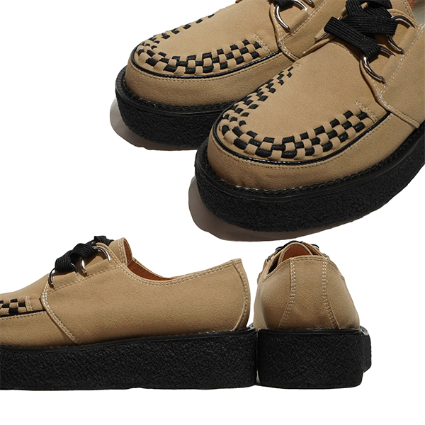 動物性の素材不使用のヴィーガンスエードレザーを使用したラバーソールシューズ。ヒールは40mm、つま先29mmの生ゴムを採用したソールは足へ衝撃を吸収し、日本人向けの木型で履き疲れしにくいモデルです。6番ソールをベースに作られ、ラバーソールらしいシルエットと驚異の軽さを実現しています。つま先の編み込みまでこだわった仕様で、ライブハウスやコンサート会場、音楽の現場で履いてほしい、履くだけでサブカルチャーを感じられる靴です。