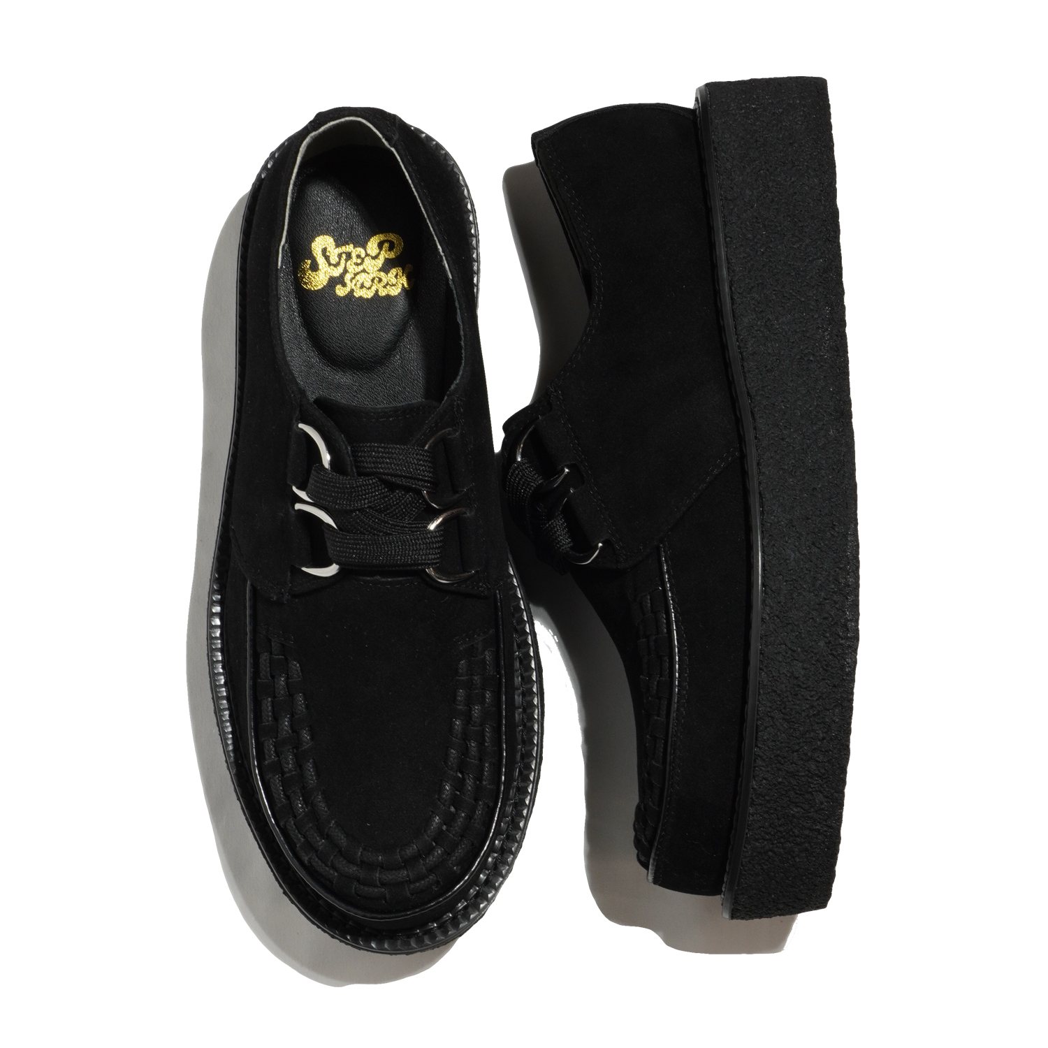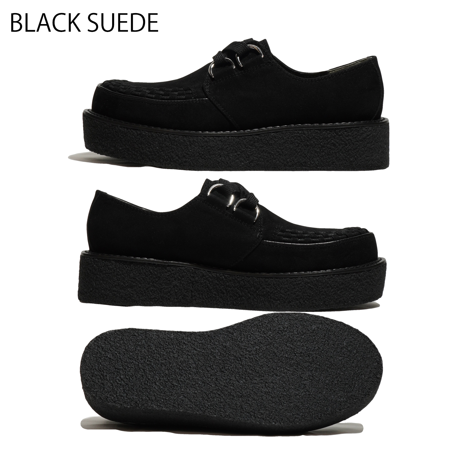 動物性の素材不使用のヴィーガンスエードレザーを使用したラバーソールシューズ。ヒールは40mm、つま先29mmの生ゴムを採用したソールは足へ衝撃を吸収し、日本人向けの木型で履き疲れしにくいモデルです。6番ソールをベースに作られ、ラバーソールらしいシルエットと驚異の軽さを実現しています。つま先の編み込みまでこだわった仕様で、ライブハウスやコンサート会場、音楽の現場で履いてほしい、履くだけでサブカルチャーを感じられる靴です。