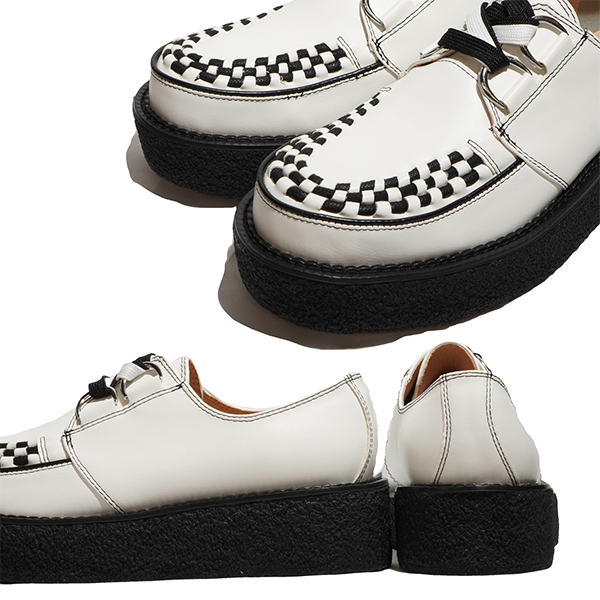 動物性の素材不使用のヴィーガンレザーを使用したラバーソールシューズ。ヒールは40mm、つま先29mmの生ゴムを採用したソールは足へ衝撃を吸収し、日本人向けの木型で履き疲れしにくいモデルです。6番ソールをベースに作られ、ラバーソールらしいシルエットと驚異の軽さを実現しています。つま先の編み込みまでこだわった仕様で、ライブハウスやコンサート会場、音楽の現場で履いてほしい、履くだけでサブカルチャーを感じられる靴です。