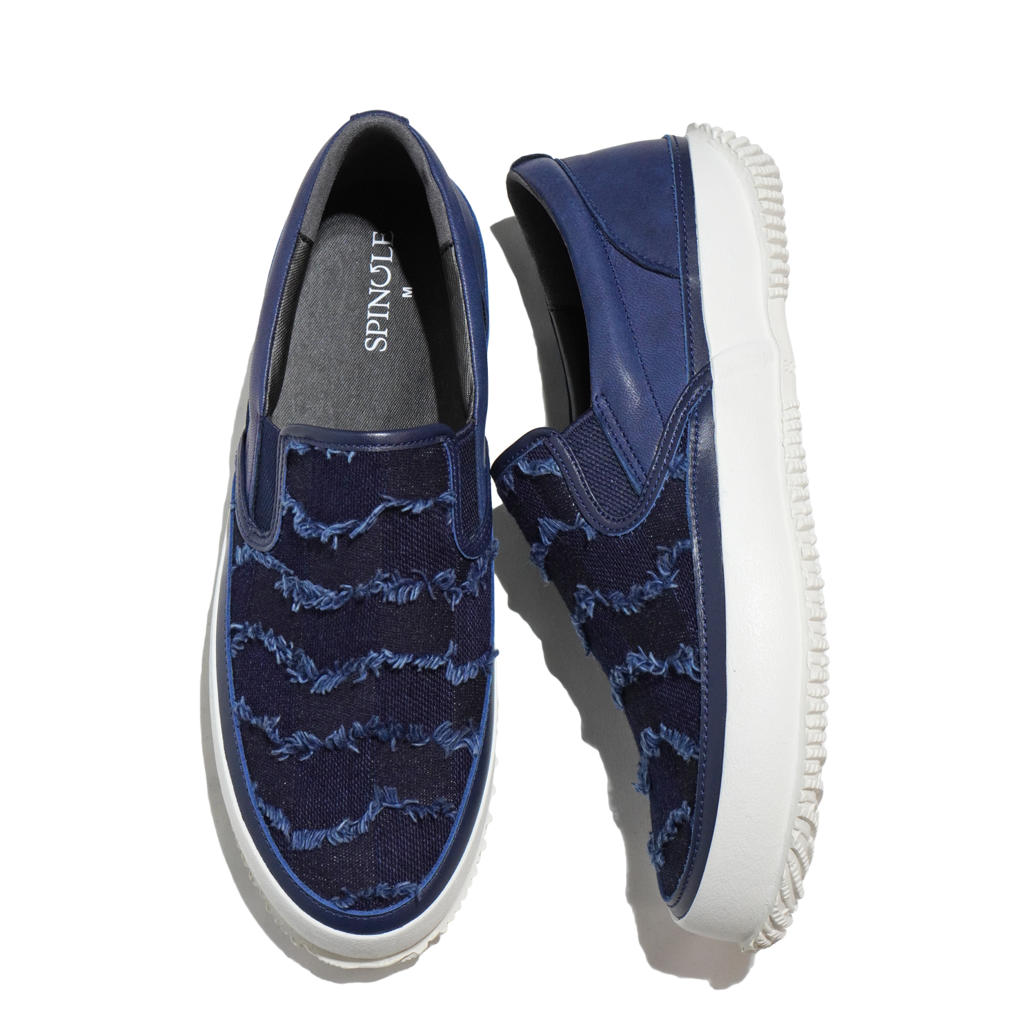 古くから日本絵画等で日本の自然美として表現される荒波をイメージしたジャガード織りスリッポン。2025年シーズンテーマ「Circle」のもと、日本の美を提唱する「Japan Beauty」を表現した一足です。アッパーには、デニムの聖地、岡山県井原市で仕上げた別注のインディゴカットジャガードを採用。織り上げた生地のヨコ糸を一本ずつカットする高度な職人技術により、立体感と繊細な柄が浮かび上がります。さらに踵部分にもインディゴ染めレザーを採用。伝統と現代が融合したラグジュアリーなデザインが足元を演出します。