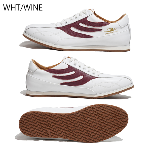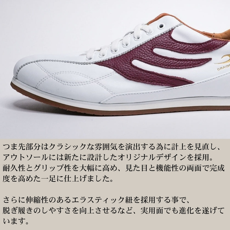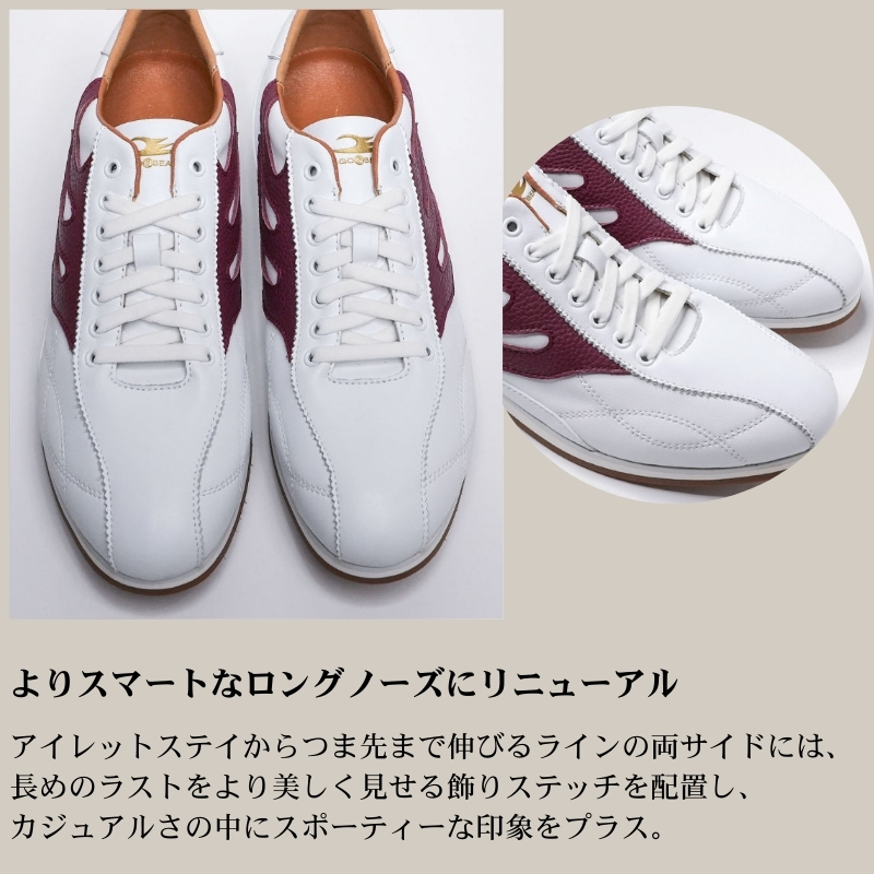 アイレットステイからつま先に伸びる、その両サイドには長めのラストをより綺麗に見せられる飾りステッチを設置しカジュアルでありながらスポーティー感を出している。