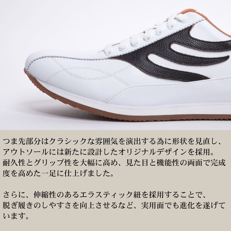 アイレットステイからつま先に伸びる、その両サイドには長めのラストをより綺麗に見せられる飾りステッチを設置しカジュアルでありながらスポーティー感を出している。