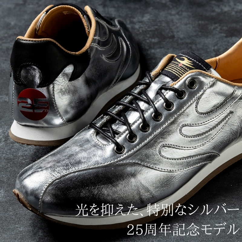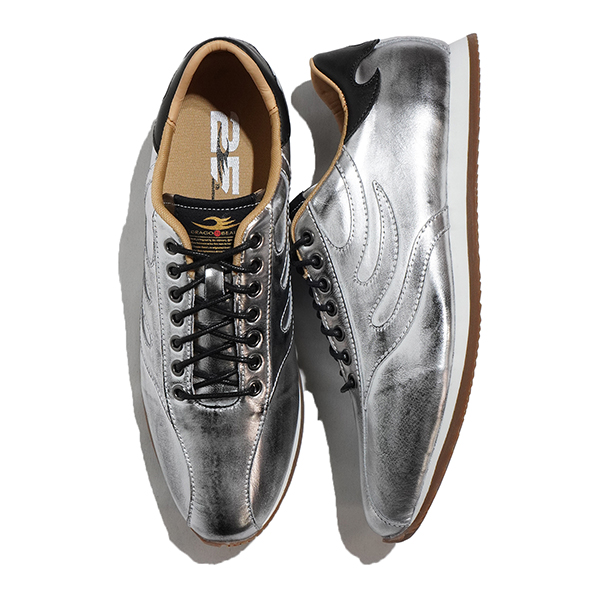 アッパーには、インパクト抜群のメタリックシルバーのレザーを採用。特殊加工により