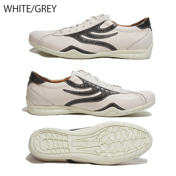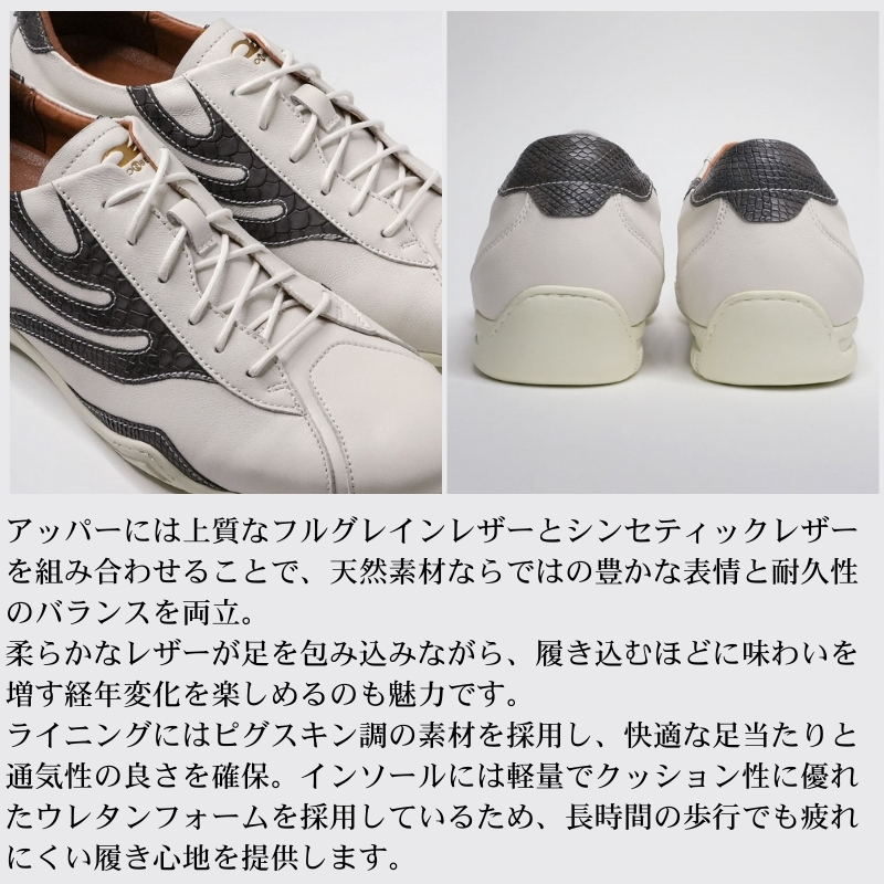 ブランドライン、サイドそしてヒールタブにスネーク型押し素材を使用する斬新なマテリアルミックスが特徴。