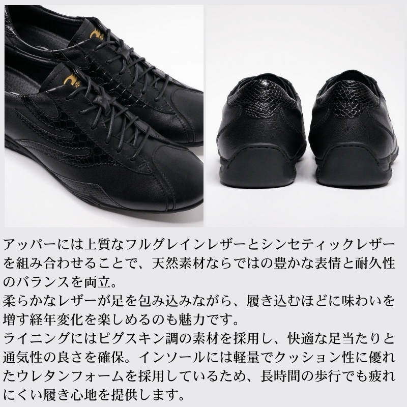 ブランドライン、サイドそしてヒールタブにスネーク型押し素材を使用する斬新なマテリアルミックスが特徴。