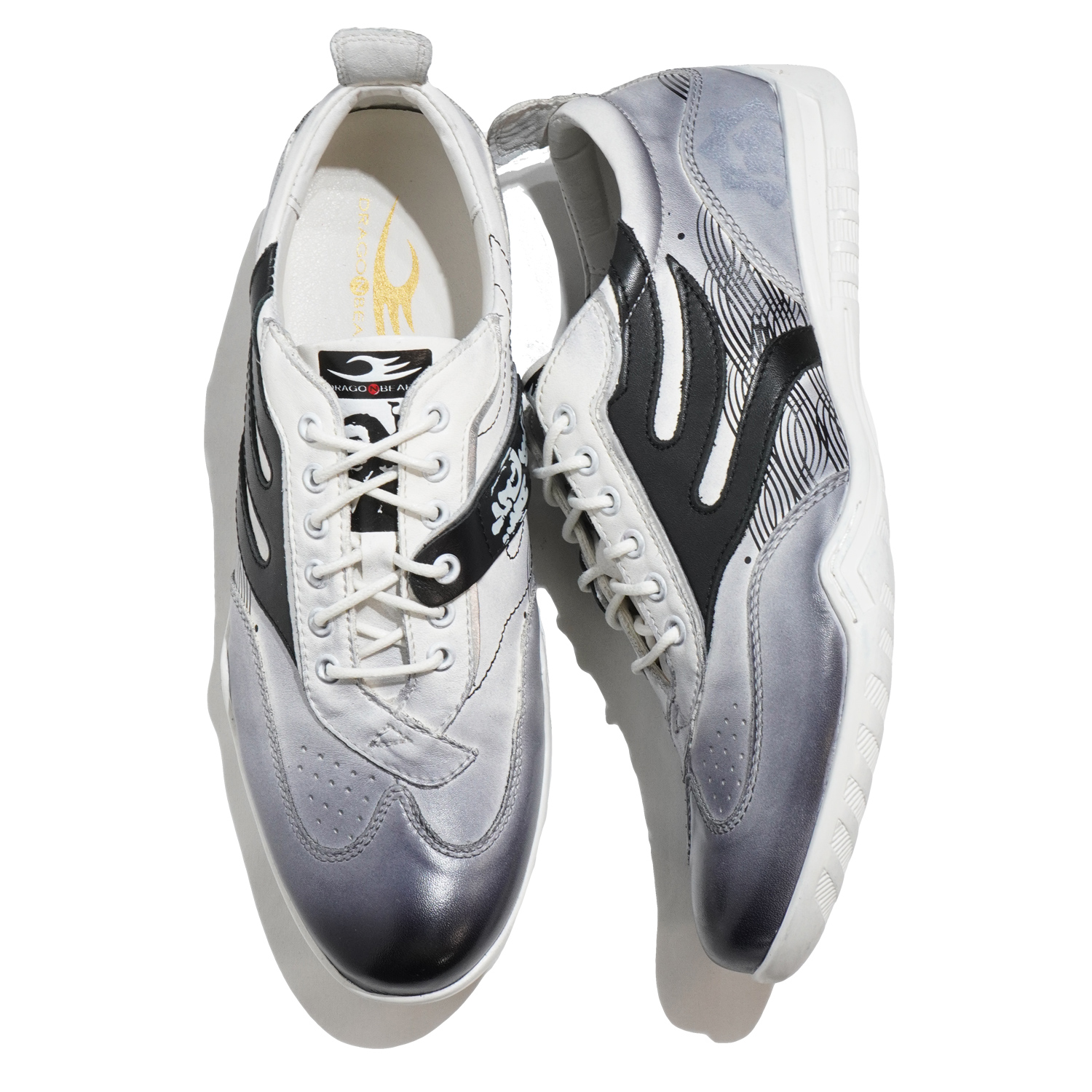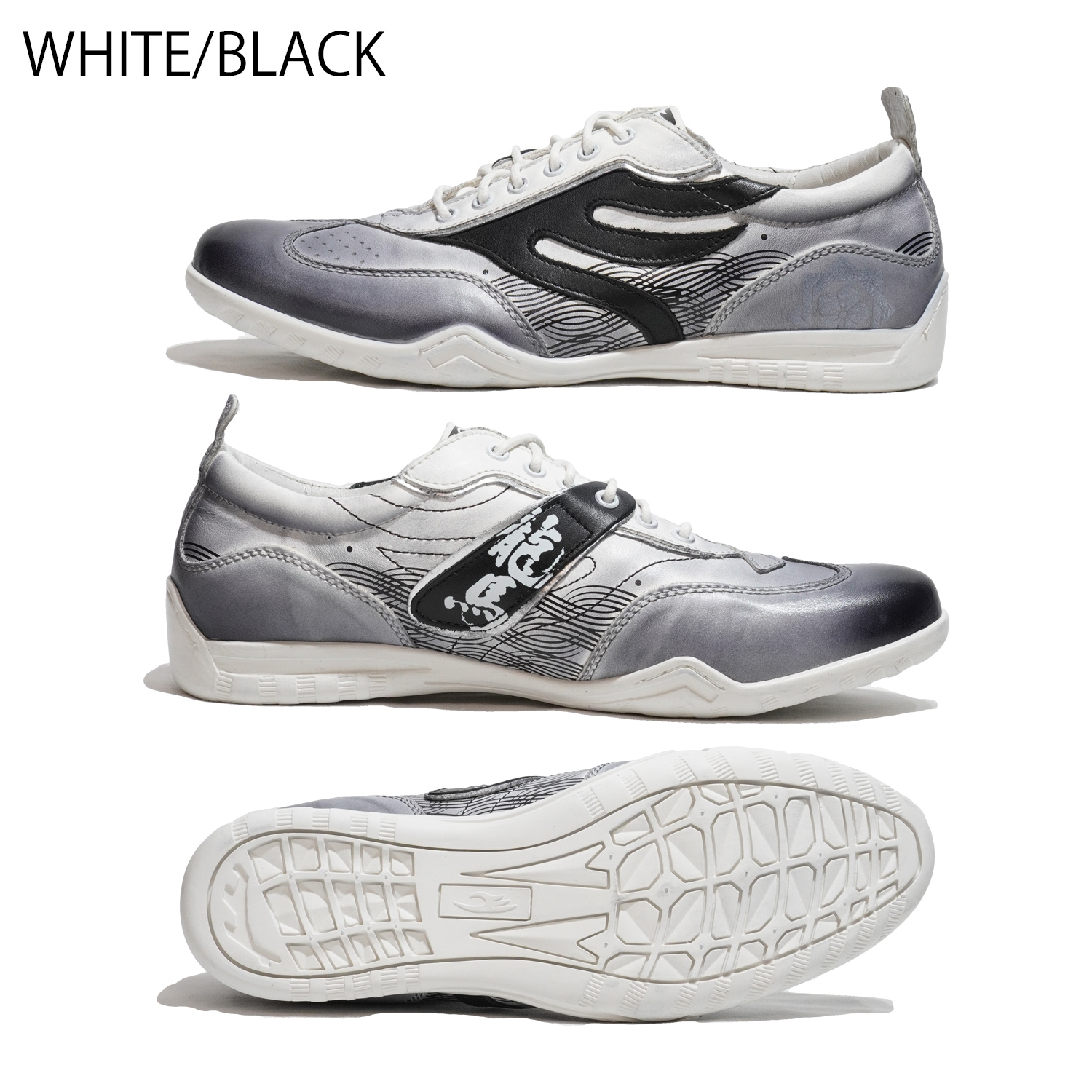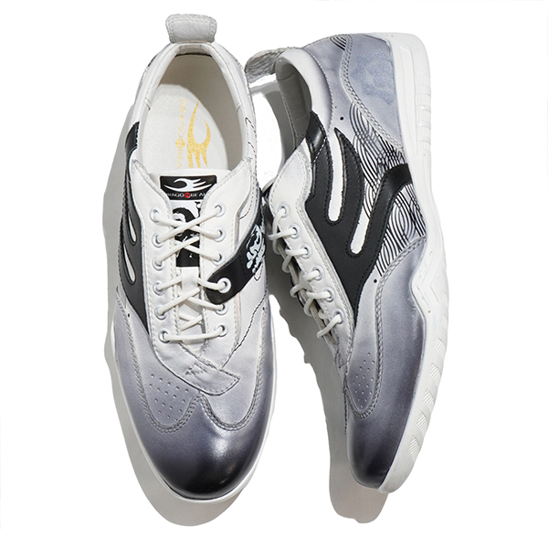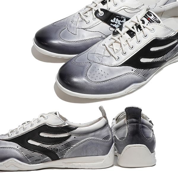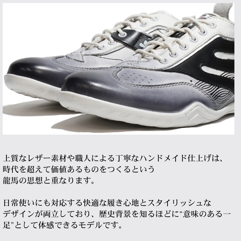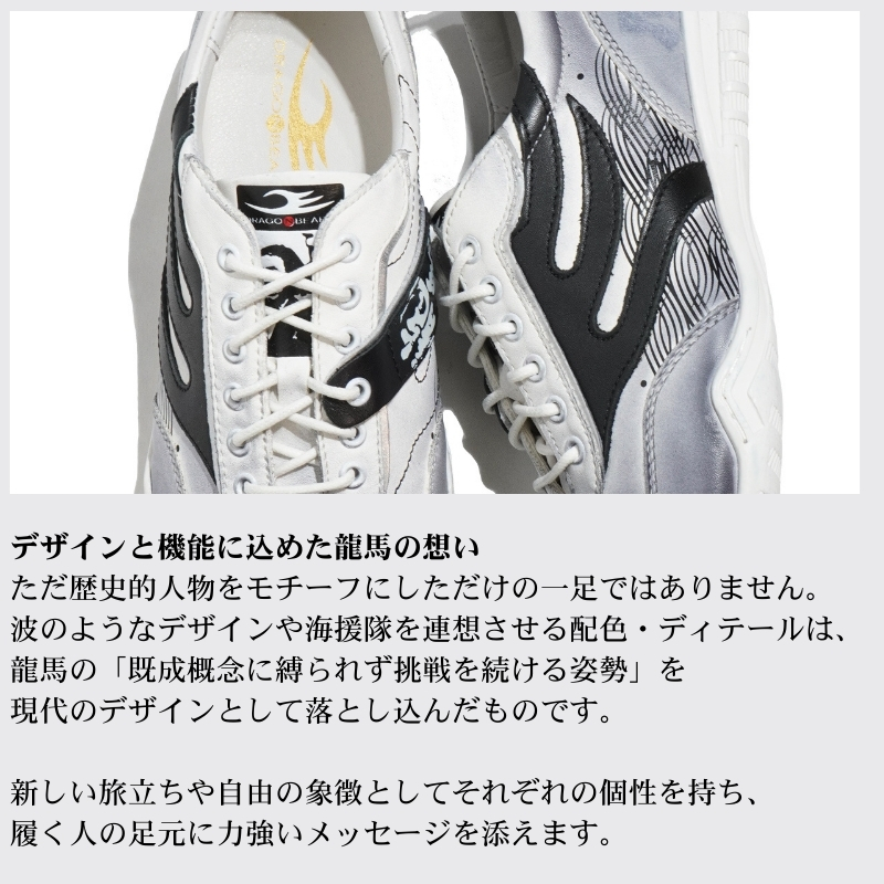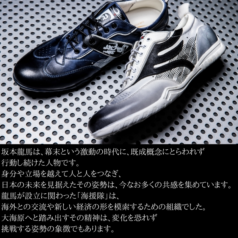 上質なカウレザーに今年は海援隊をイメージしたプリントを施したデザインは、歴史へのリスペクトと現代のスタイリッシュなアプローチを融合させたスニーカーです。