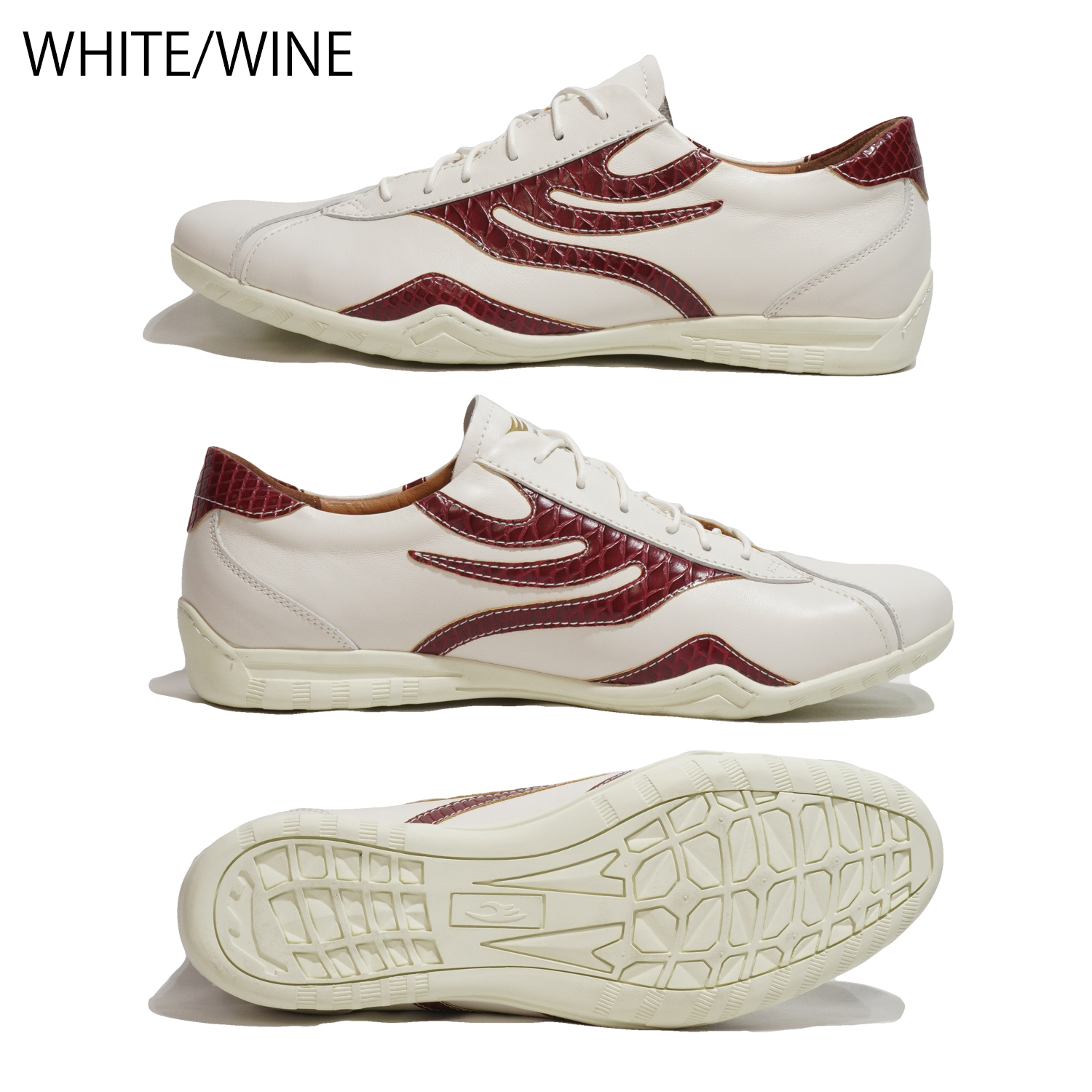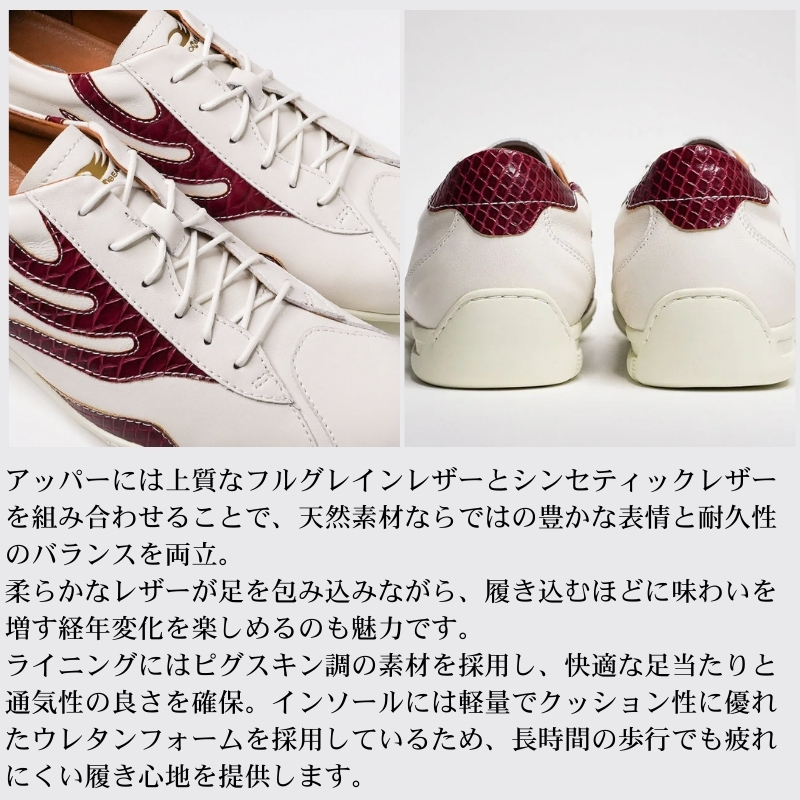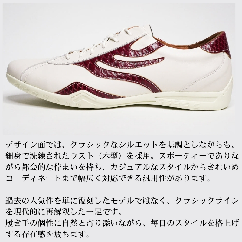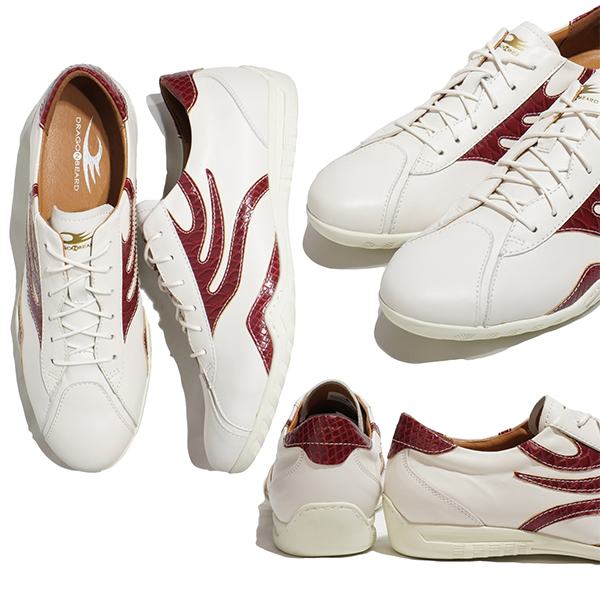 ブランドライン、サイドそしてヒールタブにスネーク型押し素材を使用する斬新なマテリアルミックスが特徴。
