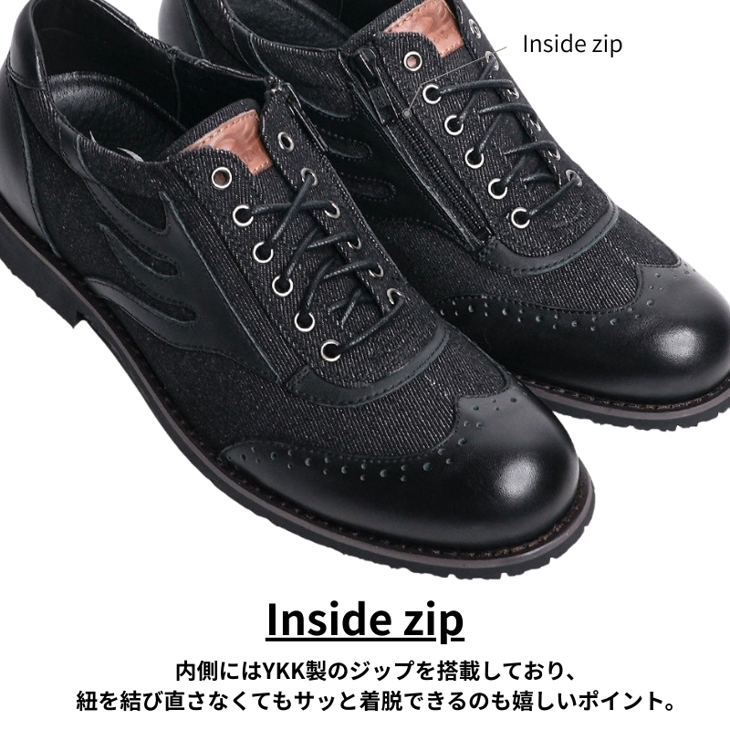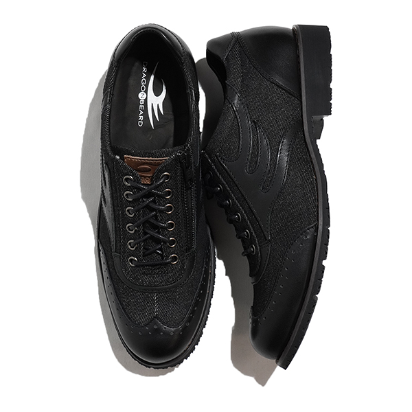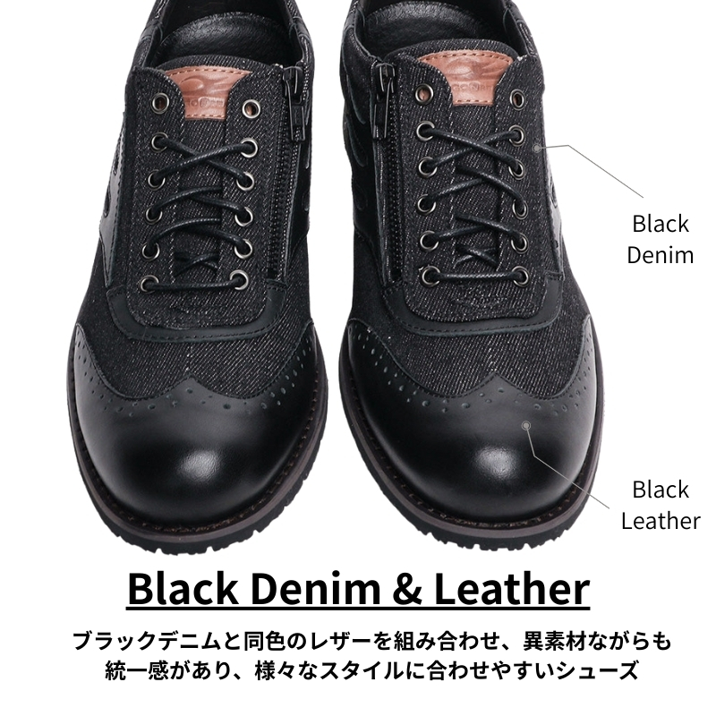 ブラックデニムと同色のレザーを組み合わせ異素材ながらも統一感があり、様々なスタイルに合わせやすいシューズとなっています。経年変化で履き始めとは違った印象が出るので長く愛用する事でより変化を楽しめる1足です。