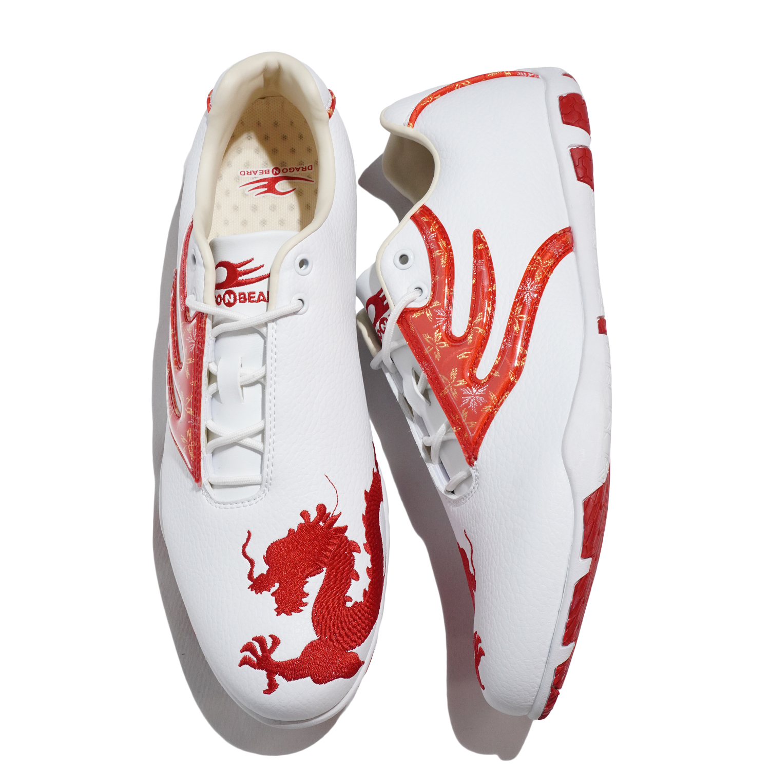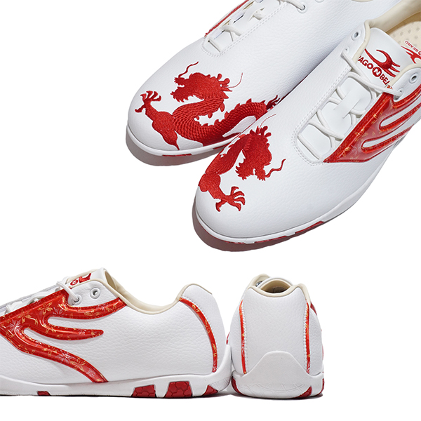 左右非対称のシューレースシステムの甲への負担を軽減する目的にドラゴンらしい派手で大胆な龍の刺繍に和柄にて人気を誇ったモデル。