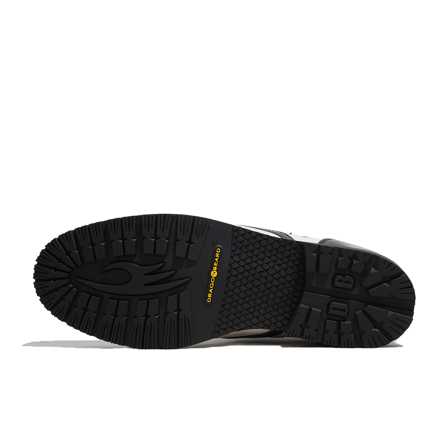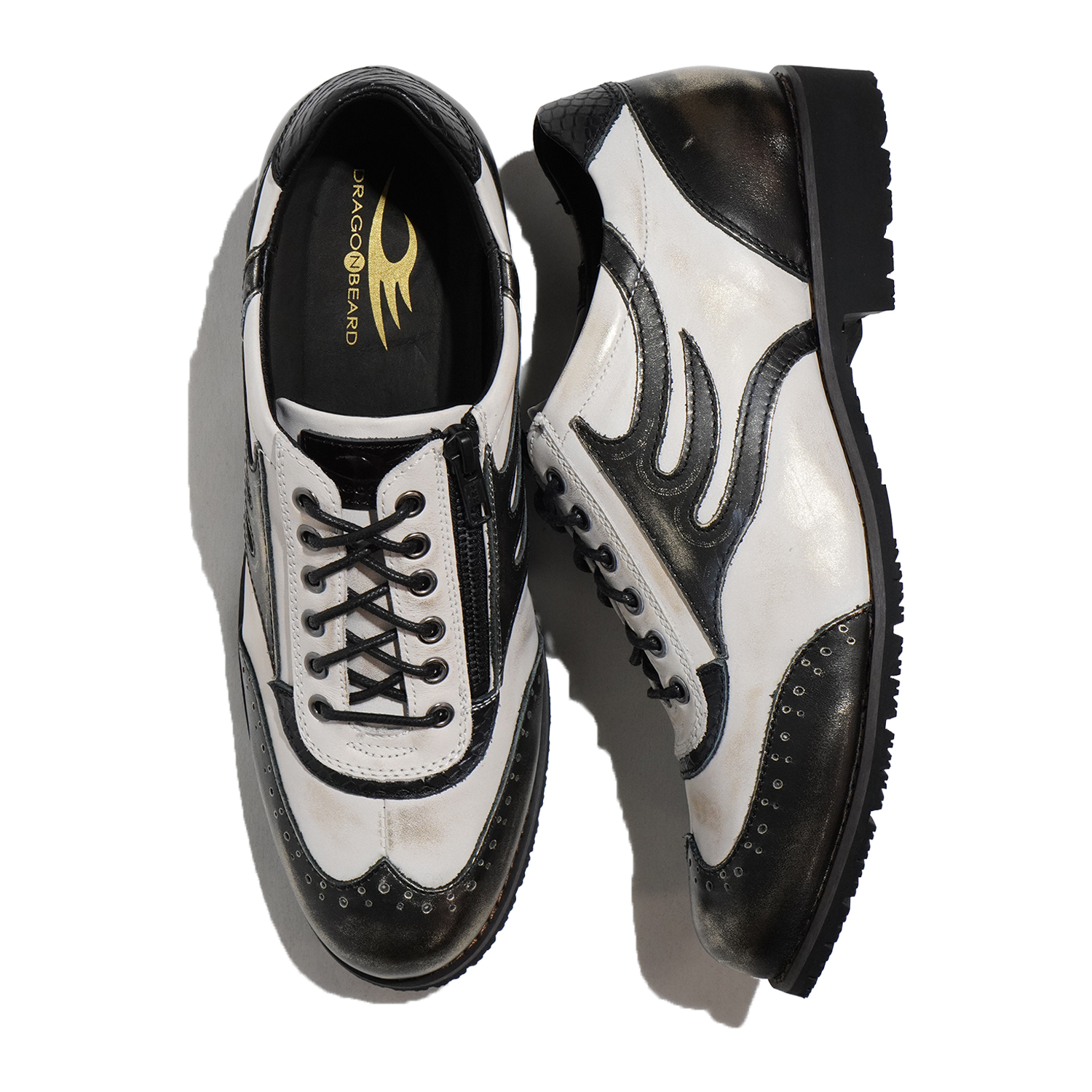 クラシックなウィングチップスタイルに、黒×白のバイカラーデザインが映える個性派レザー短靴。