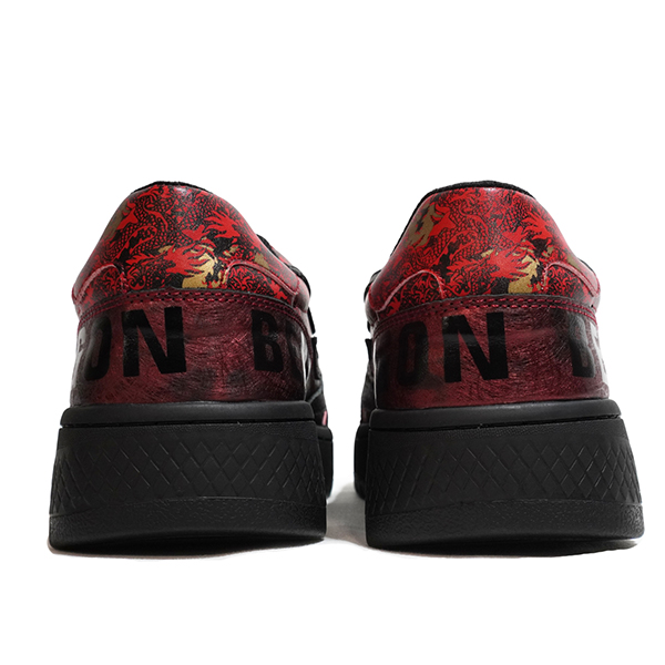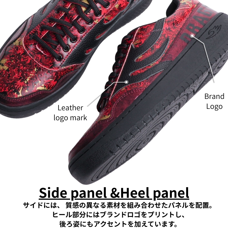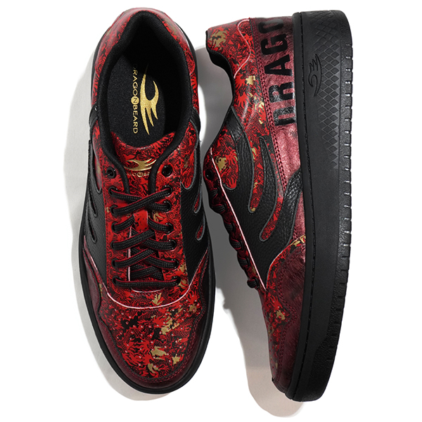 燃えるような紅と黒のコントラストが目を引く、DRAGON BEARDの「龍」をテーマにしたグラフィックデザインスニーカー。