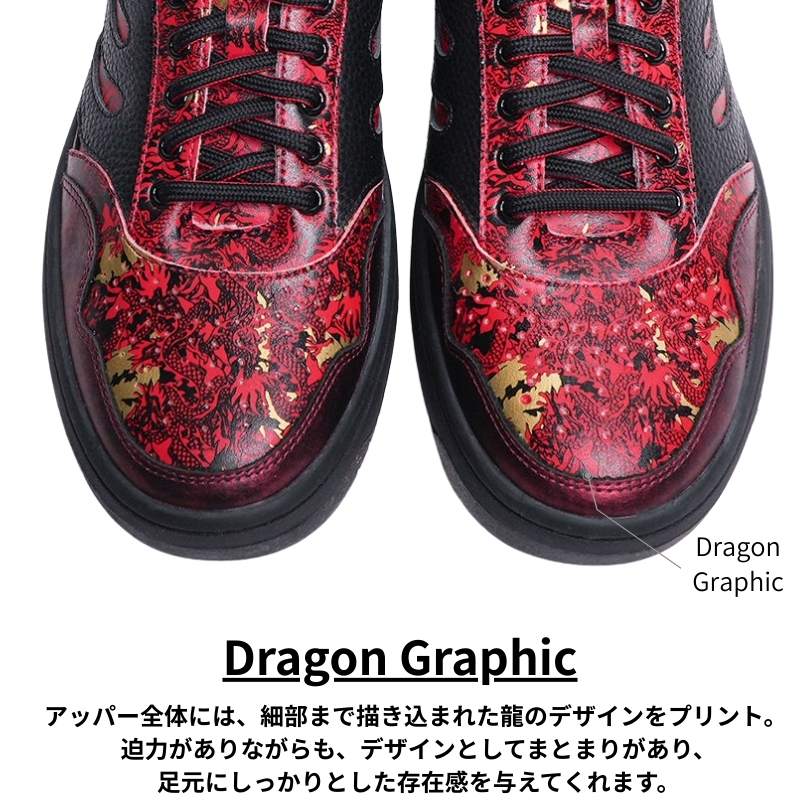 アッパー全体には、細部まで描き込まれた龍のデザインをプリント。迫力がありながらも、デザインとしてまとまりがあり、足元にしっかりとした存在感を与えてくれます。
