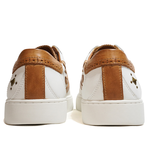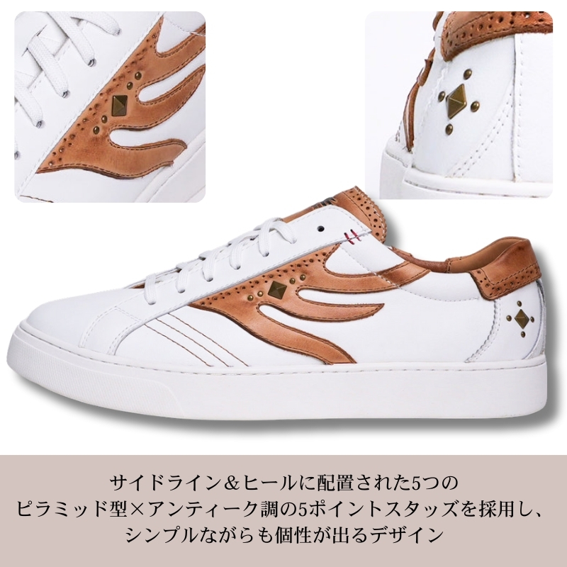 アッパーには滑らかなホワイトレザー、部分パーツにはには焦しレザーを採用。