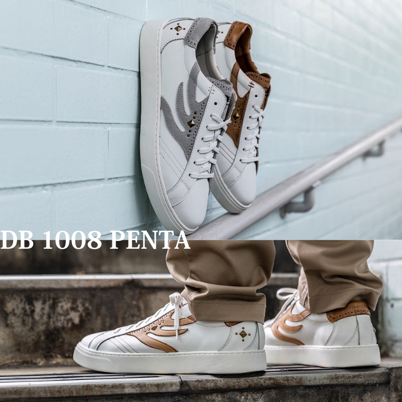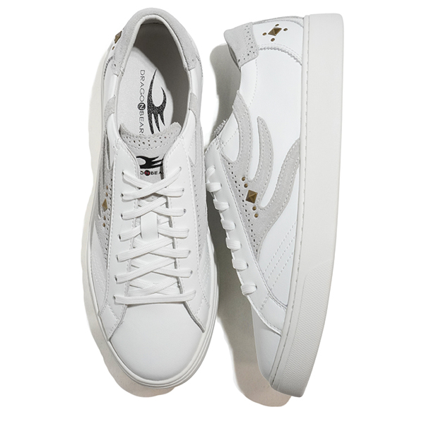 アッパーには滑らかなホワイトレザー、部分パーツにはには焦しレザーを採用。