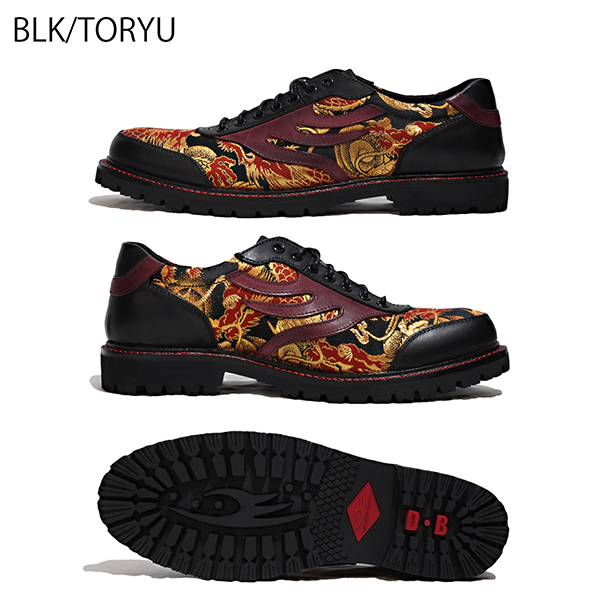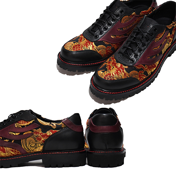 アッパーには上質なカーフレザーを使用。黒×赤の配色が映えるよう、アウトソールのウェルトには黒革をベースに太めの赤ステッチを施し、燃え上がるような“火龍”をイメージ。日本の伝統とアヴァンギャルドなスタイルが絶妙に融合したデザインです。